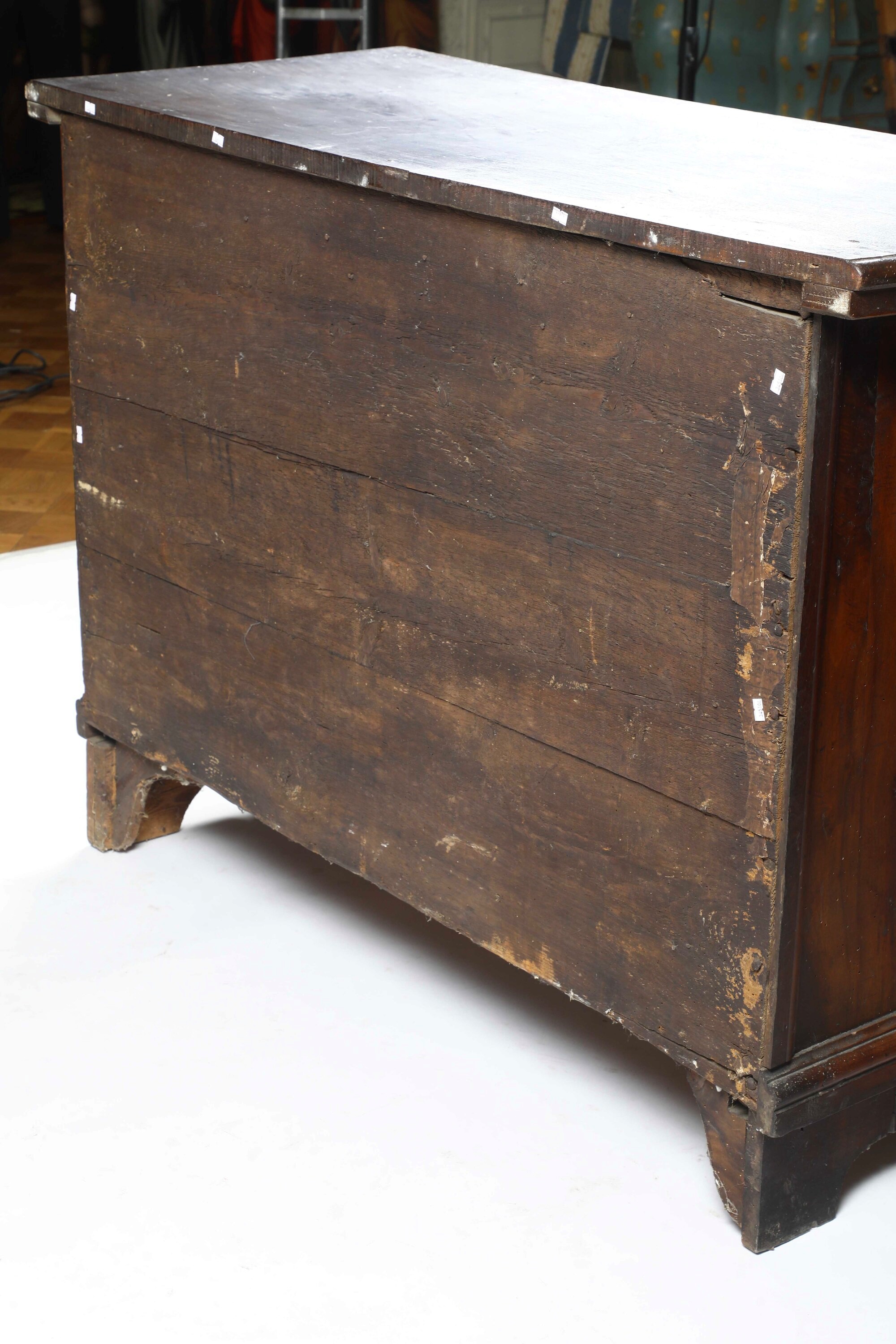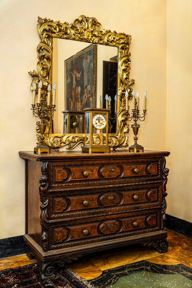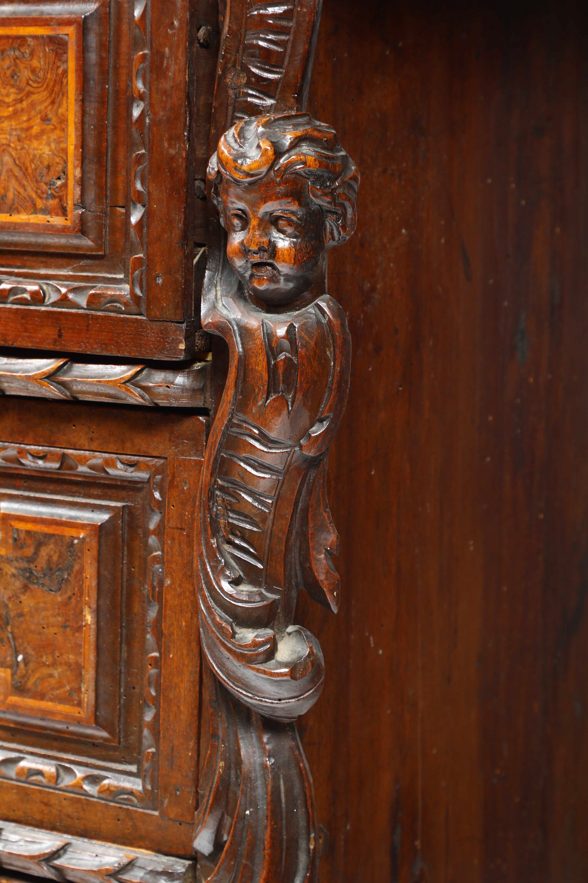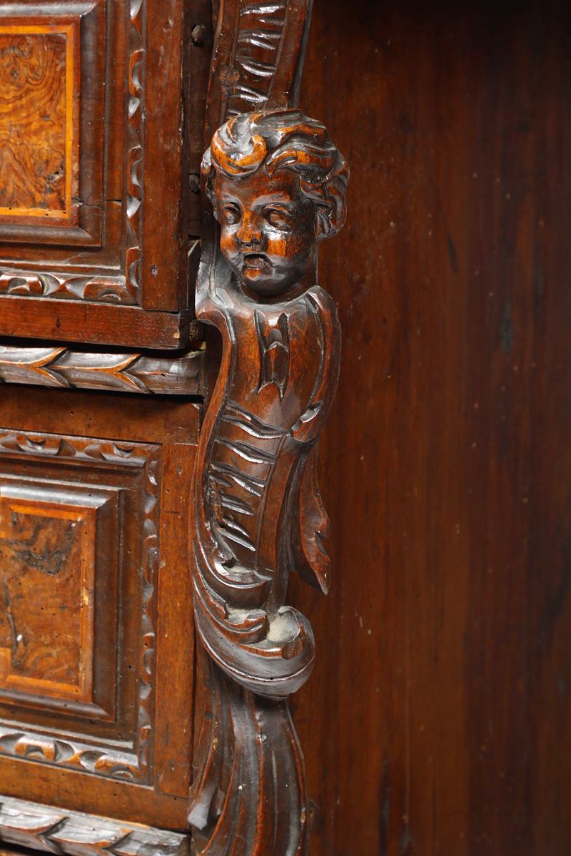 Fronte a tre cassetti pannellati e lastronati in radica con bordo intagliato a foglie, montanti angolari scolpiti a volute e putti, piedi a volute (difetti e restauri)