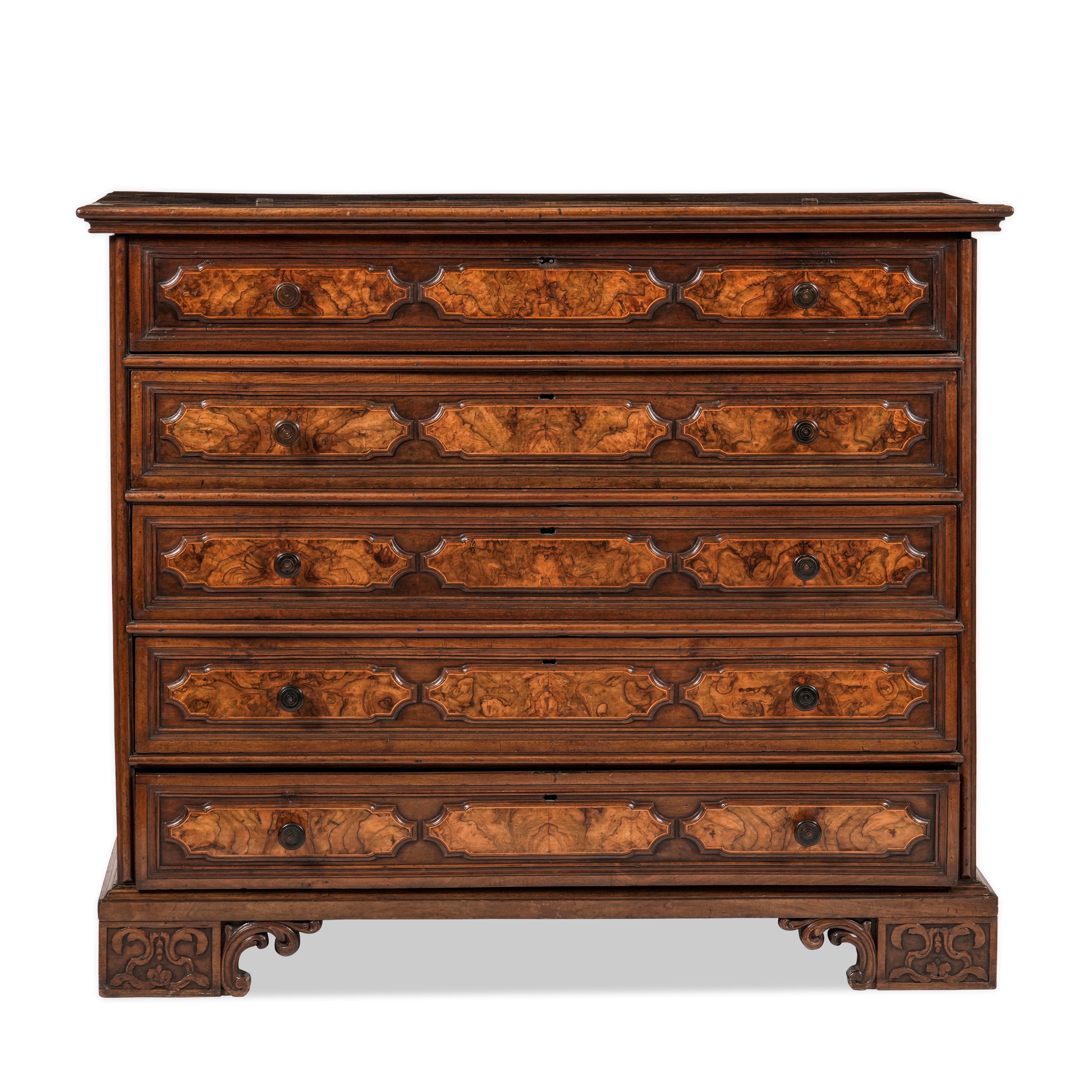 Cinque cassetti di cui quello superiore ribaltabile e celante scarabattolo. Fronte decorato a riserve sagomate in radica, piedi intagliati