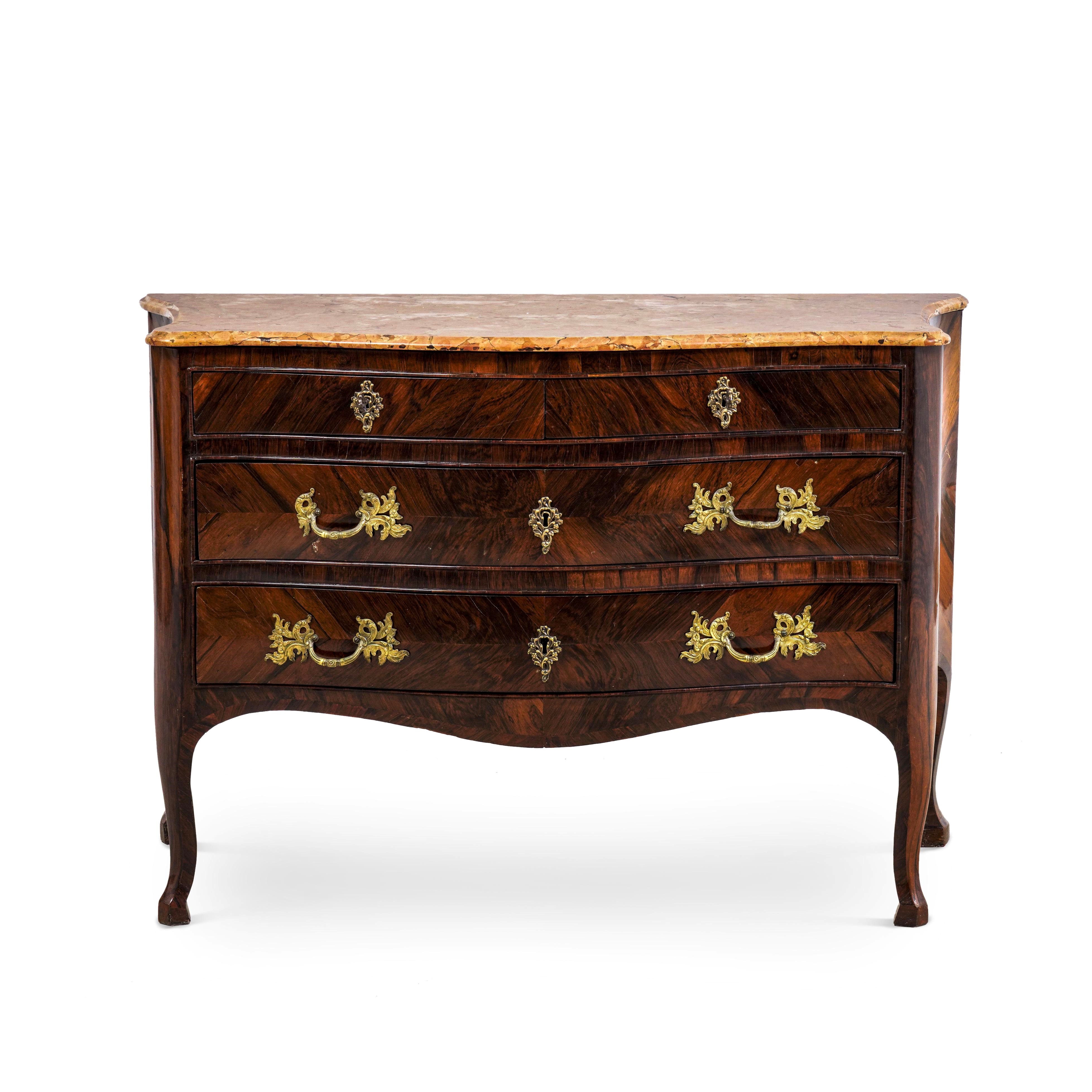 Lastronato in palissandro, fronte mosso a due cassetti e due cassettini affiancati, fianchi e gambe mossi, piano sagomato in marmo non coevo
