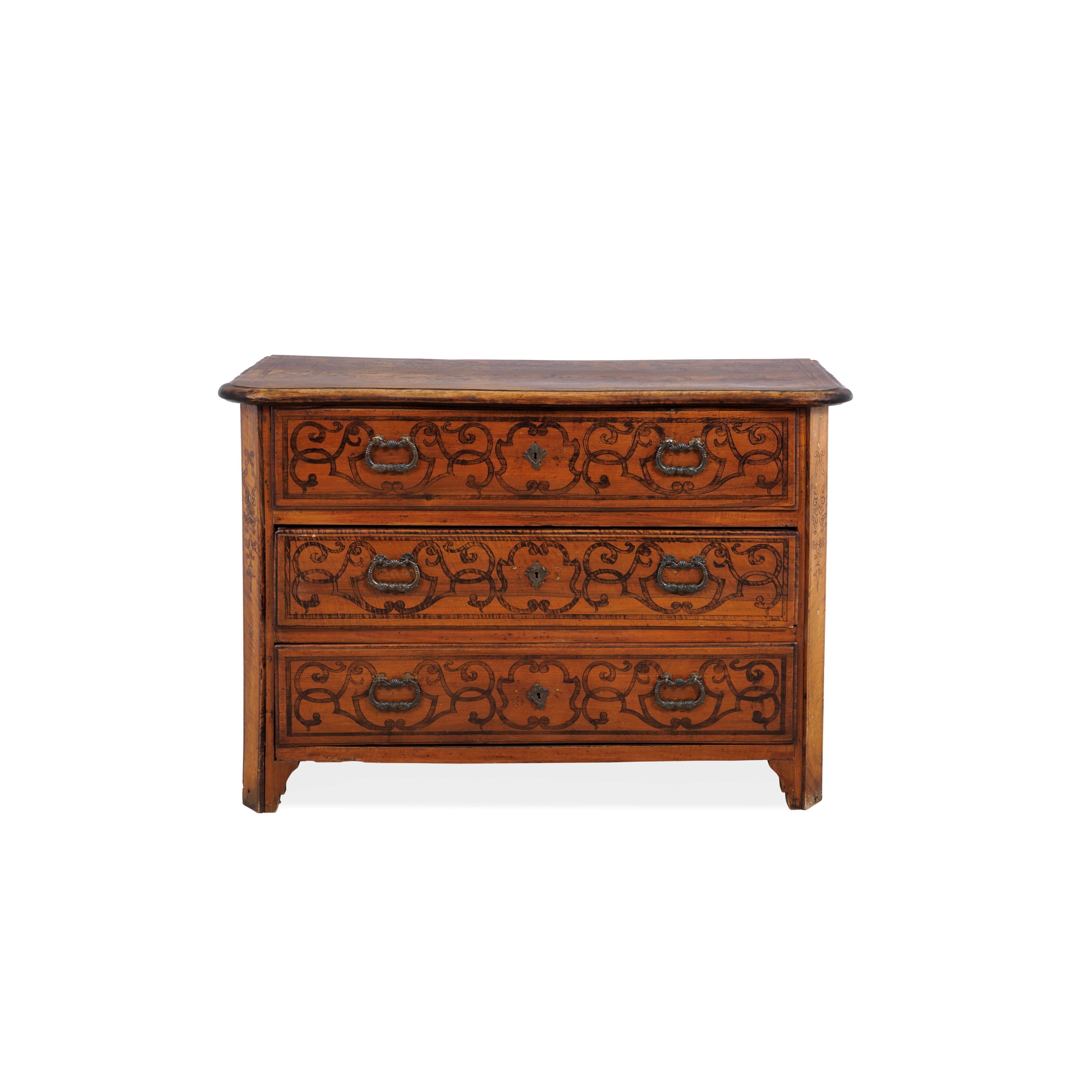 Noce massello. Fronte a tre cassetti con decoro pirografato a volute intrecciate