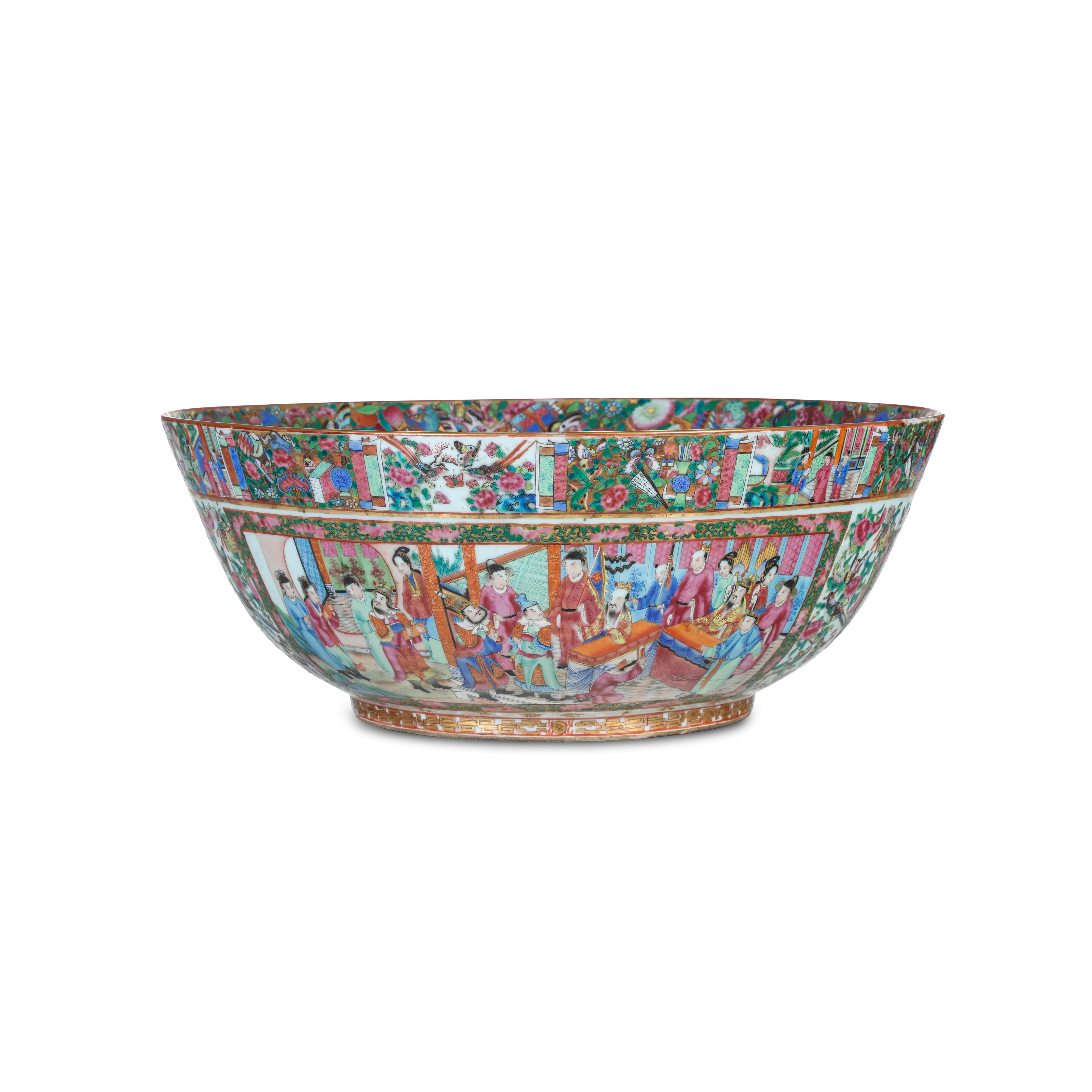 Ciotola in porcellana raffigurante scena di corte entro riserva con decori a motivi floreali, Canton, Cina, Dinastia Qing, [..]