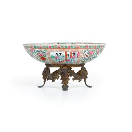 Ciotola in porcellana raffigurante scena di corte entro riserva con decori a motivi floreali con montatura in bronzo, Canton, [..]