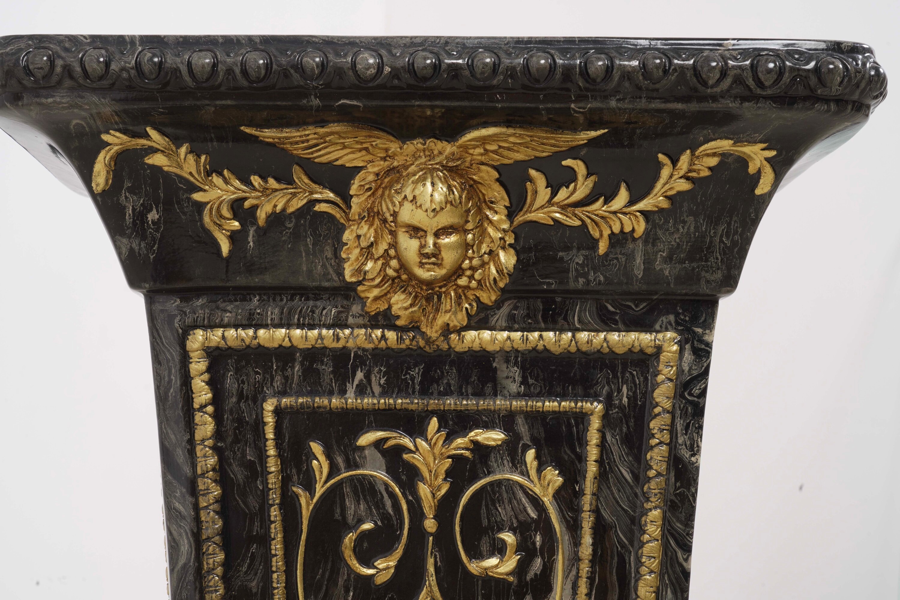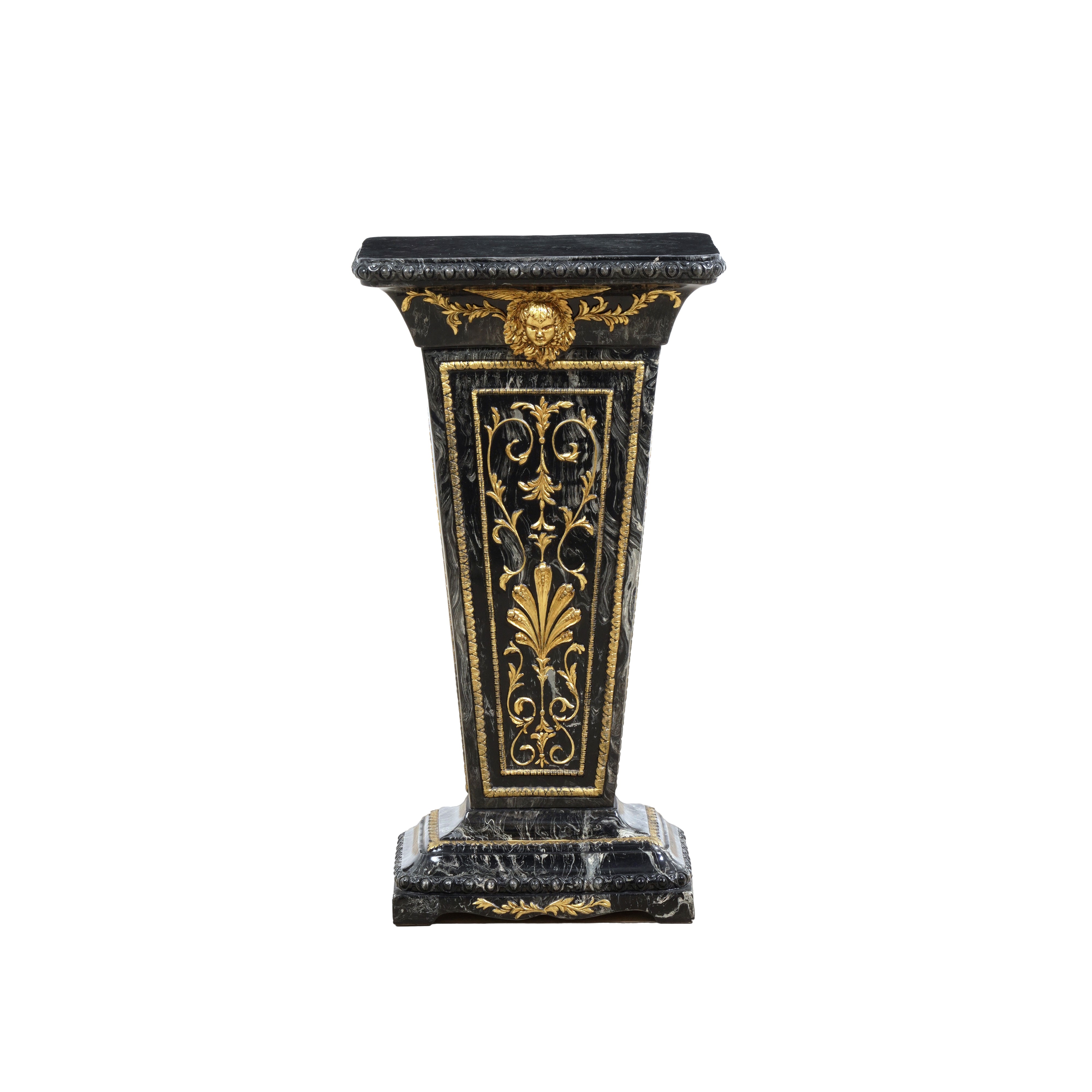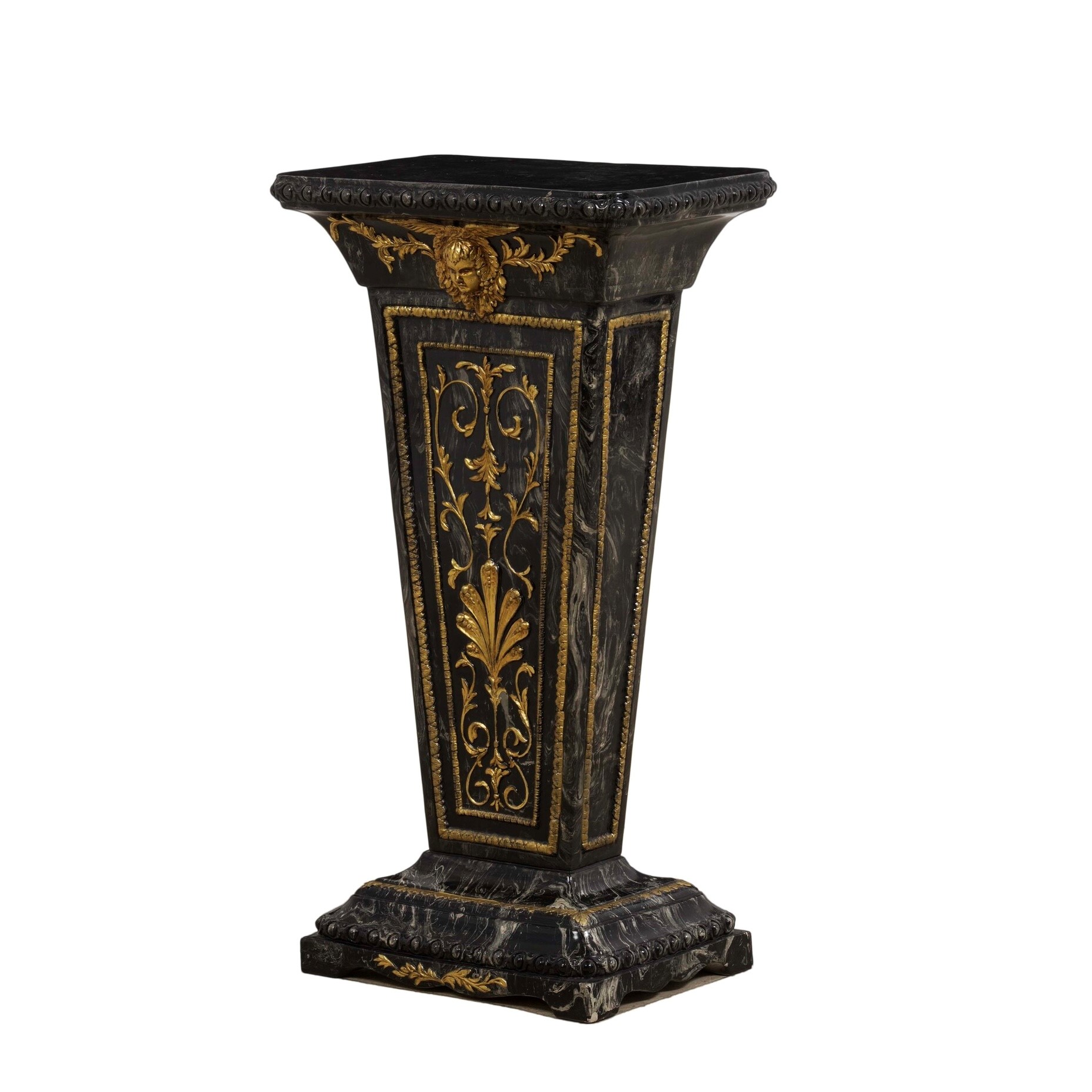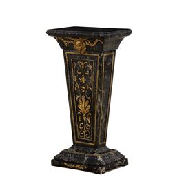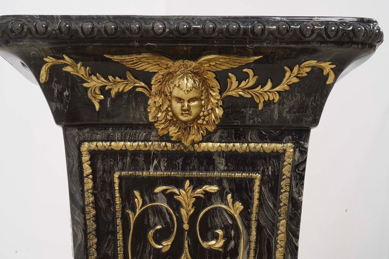 Terraglia dipinta e ornata da fregi dorati a mascheroni e motivi vegetali, in forma di balaustro architettonico con base squadrata.