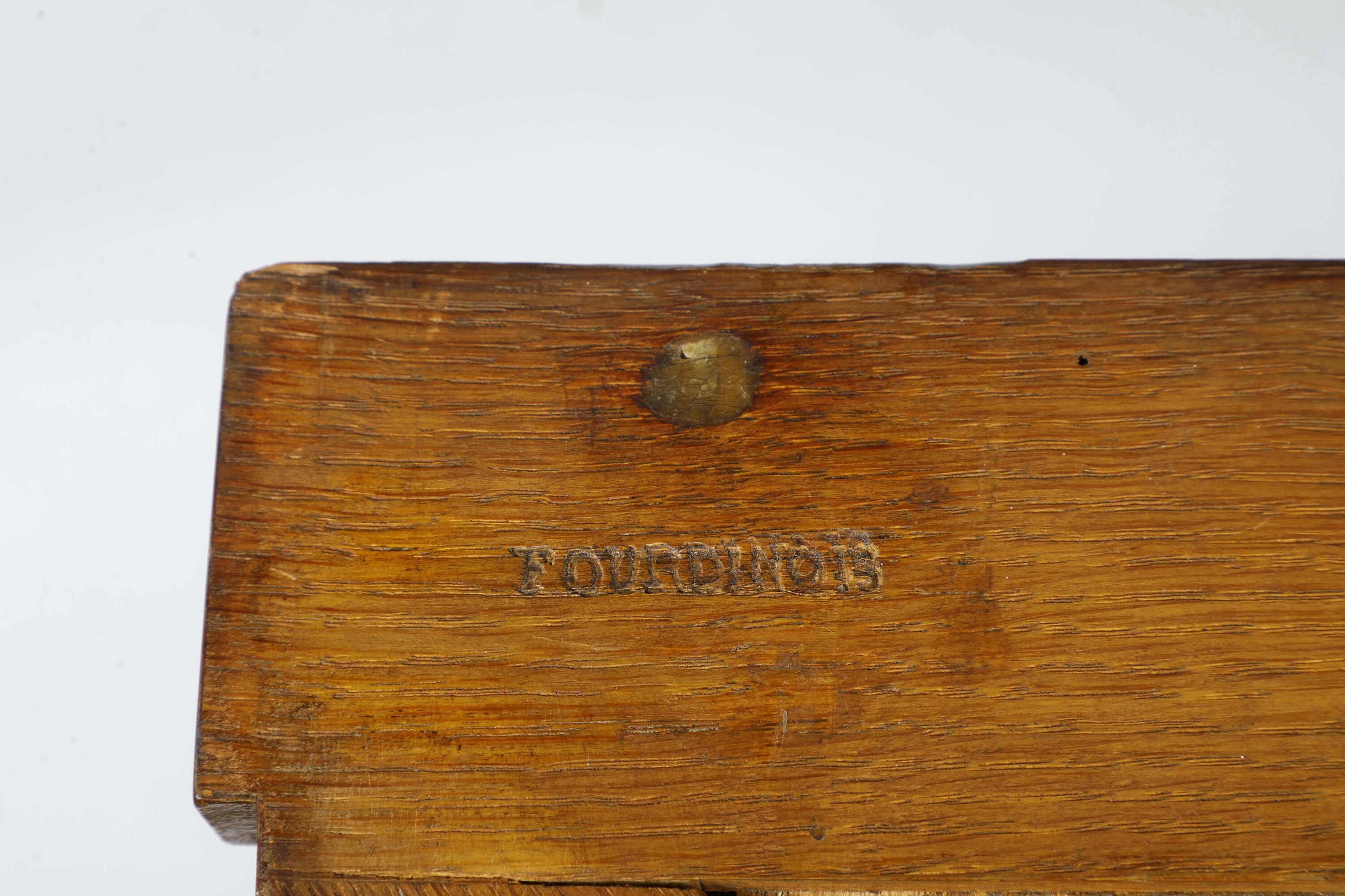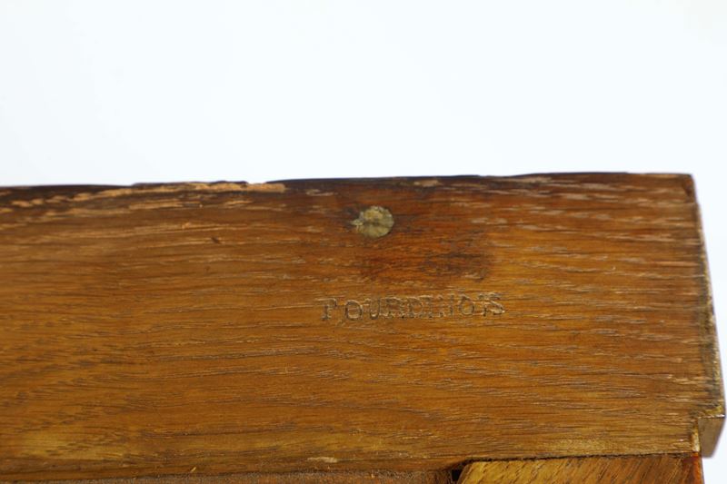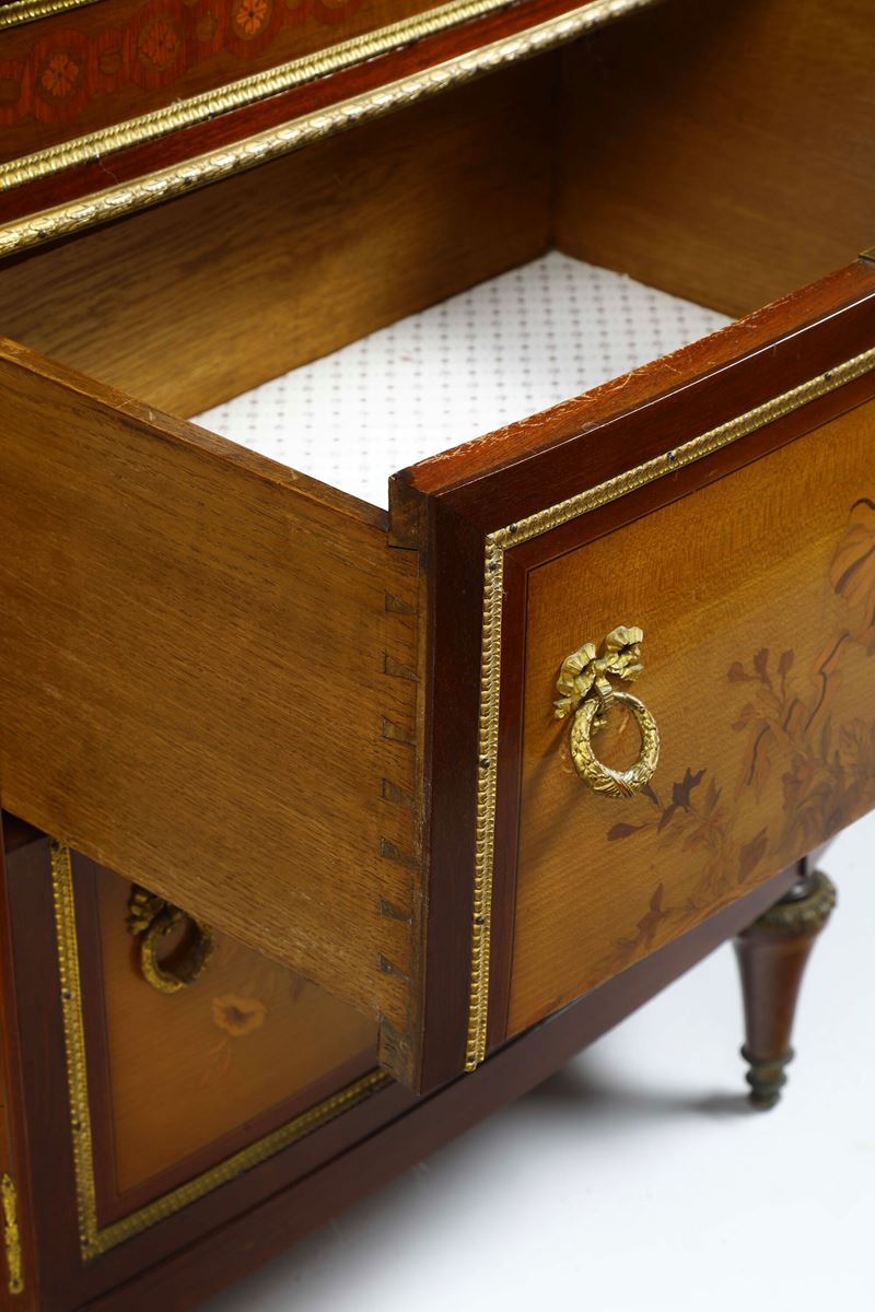 Legno lastronato e intarsiato in bois de rose, bois d'amaranthe, bois de violette. Fronte a due cassetti senza traverse sormontati da un cassettino sottopiano, due ante nei fianchi. Marqueterie a rombi nei fianchi e bouquet di fiori sul fronte, montanti scanalati, piano in marmo sagomato, piedi troncoconici, applicazioni e cornici in bronzo dorato. Il mobile porta sul piano la firma a fuoco di: FOURDINOIS
