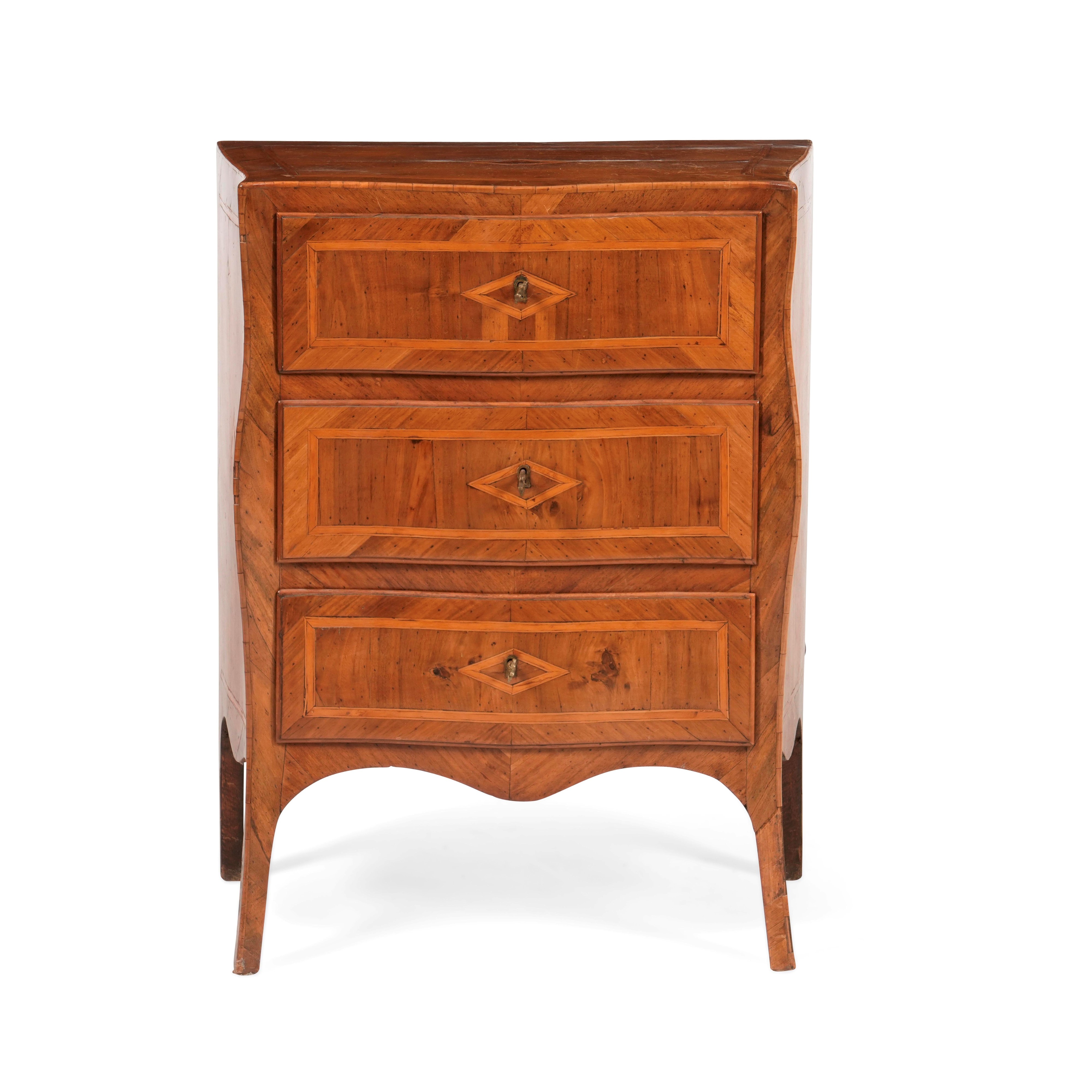 Fronte mosso a tre cassetti incorniciati da filetti e motivi geometrici, grembiale sagomato