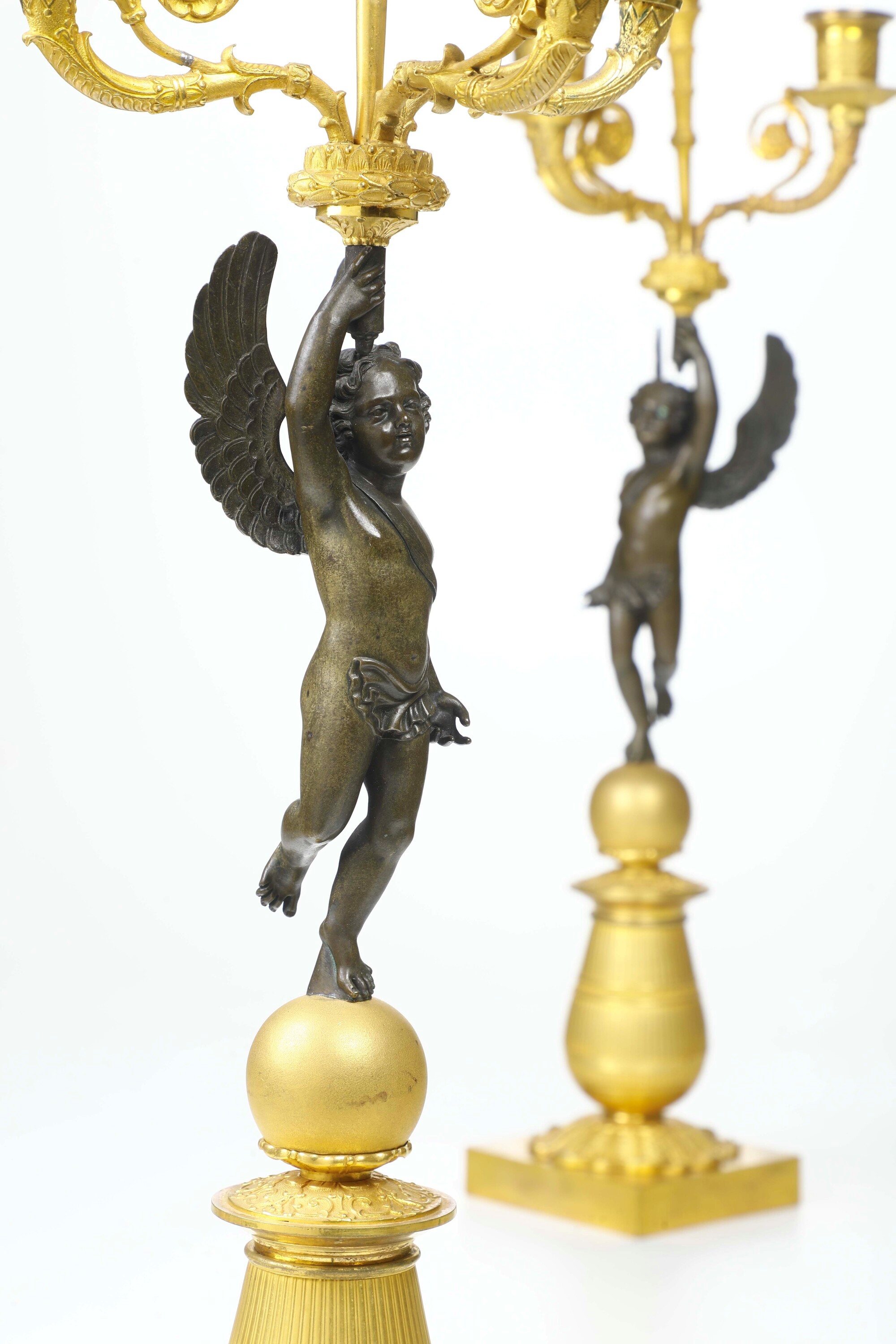 Bronzo dorato e bronzo patinato. Fusto in forma di putti alati che reggono una fiamma e tre bracci porta candele, poggianti su sfera e balaustro cesellato con foglie d'acanto