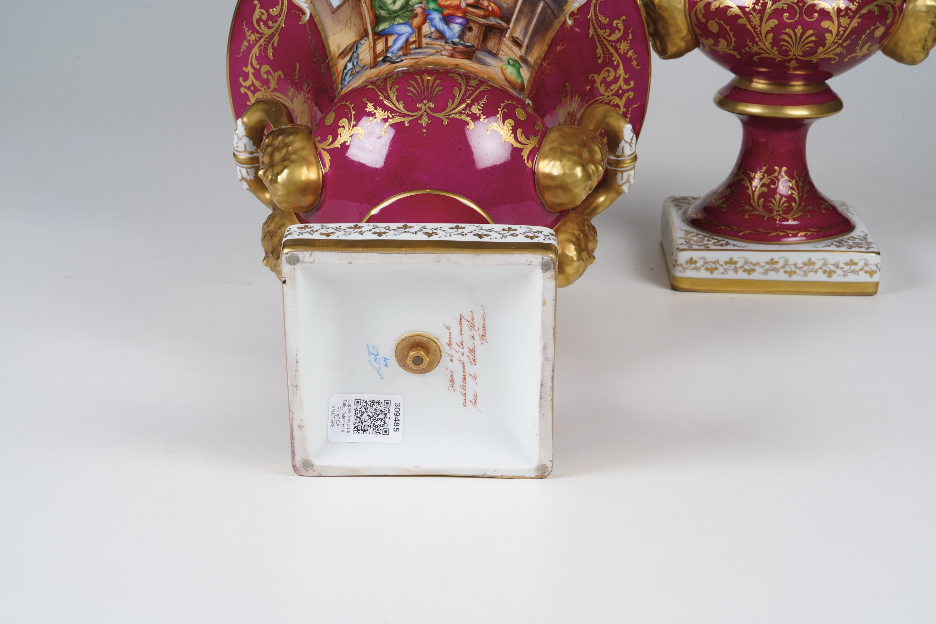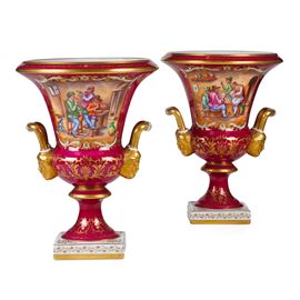 Vasi di forma medicea con manici dalla base modellata a mascherone. La decorazione è dipinta a mano in policromia e oro. Su fondo color porpora due riserve ospitano rispettivamente una scena con personaggi all'interno di un'osetria, riprese dalla pittura fiamminga del XVII secolo, e un esuberante bouquet di fiori.