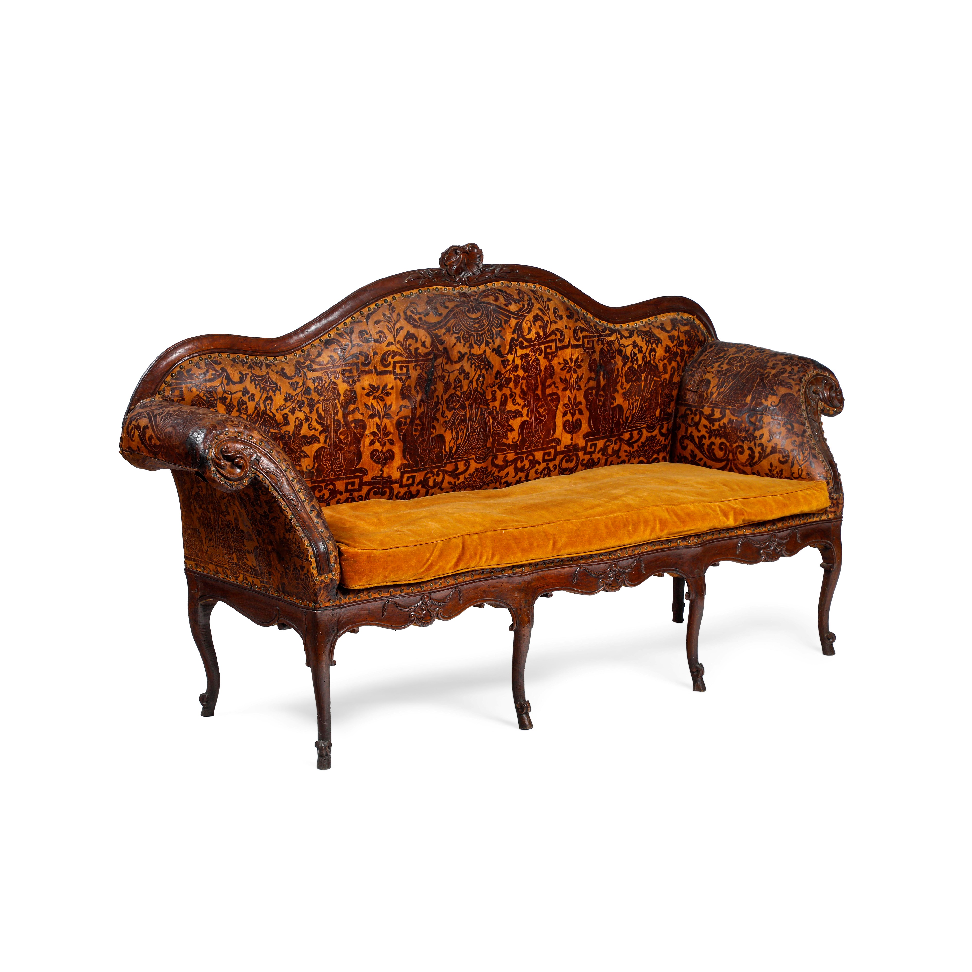 Noce intagliato. Schienale sagomato centrato da valva di conchiglia, braccioli estroflessi a volute, pendaglina sagomata arricchita da festoni vegetali, gambe mosse, imbottito e rivestito in cuoio impresso con scene di genere e motivi fitomorfi stilizzati