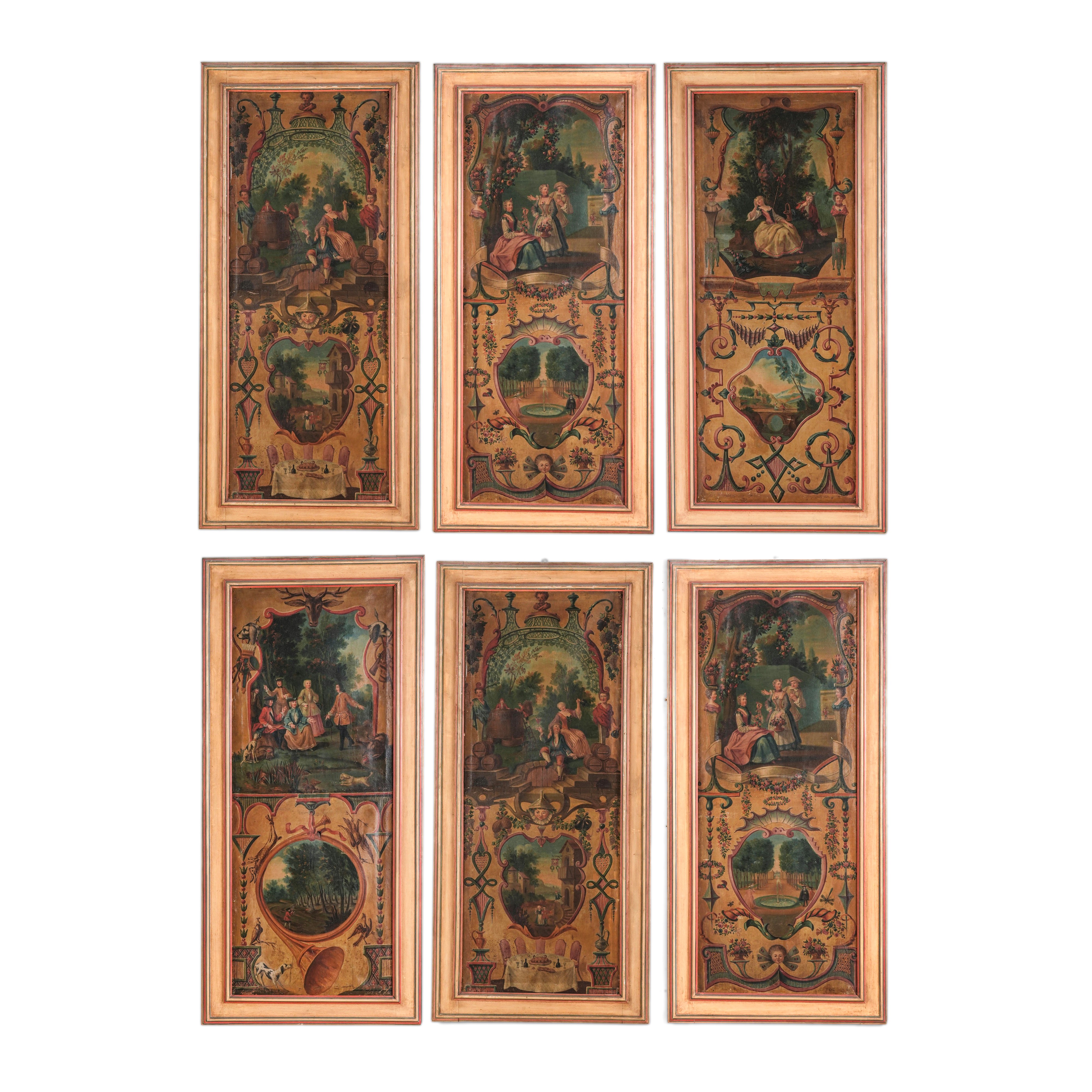 Gruppo di sei panelli dipinti con scene di genere e paesaggi. XVIII secolo