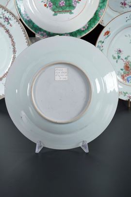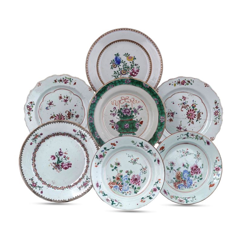 Lotto composto da sette piatti in porcellana a soggetto floreale, Cina, Dinastia Qing, XVII e XIX secolo