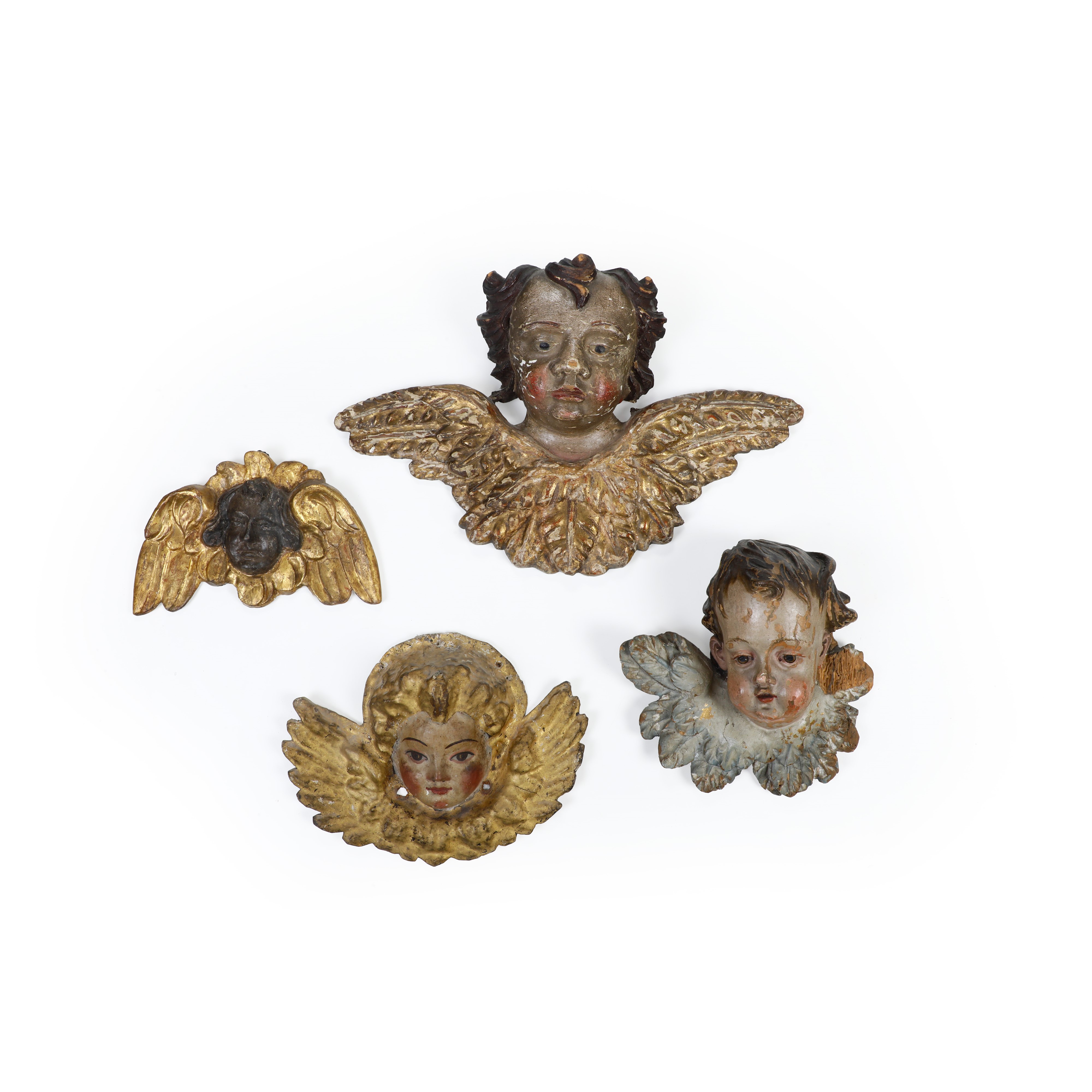 Lotto di quattro cherubini in legno intagliato, laccato e dorato. XVII-XVIII secolo