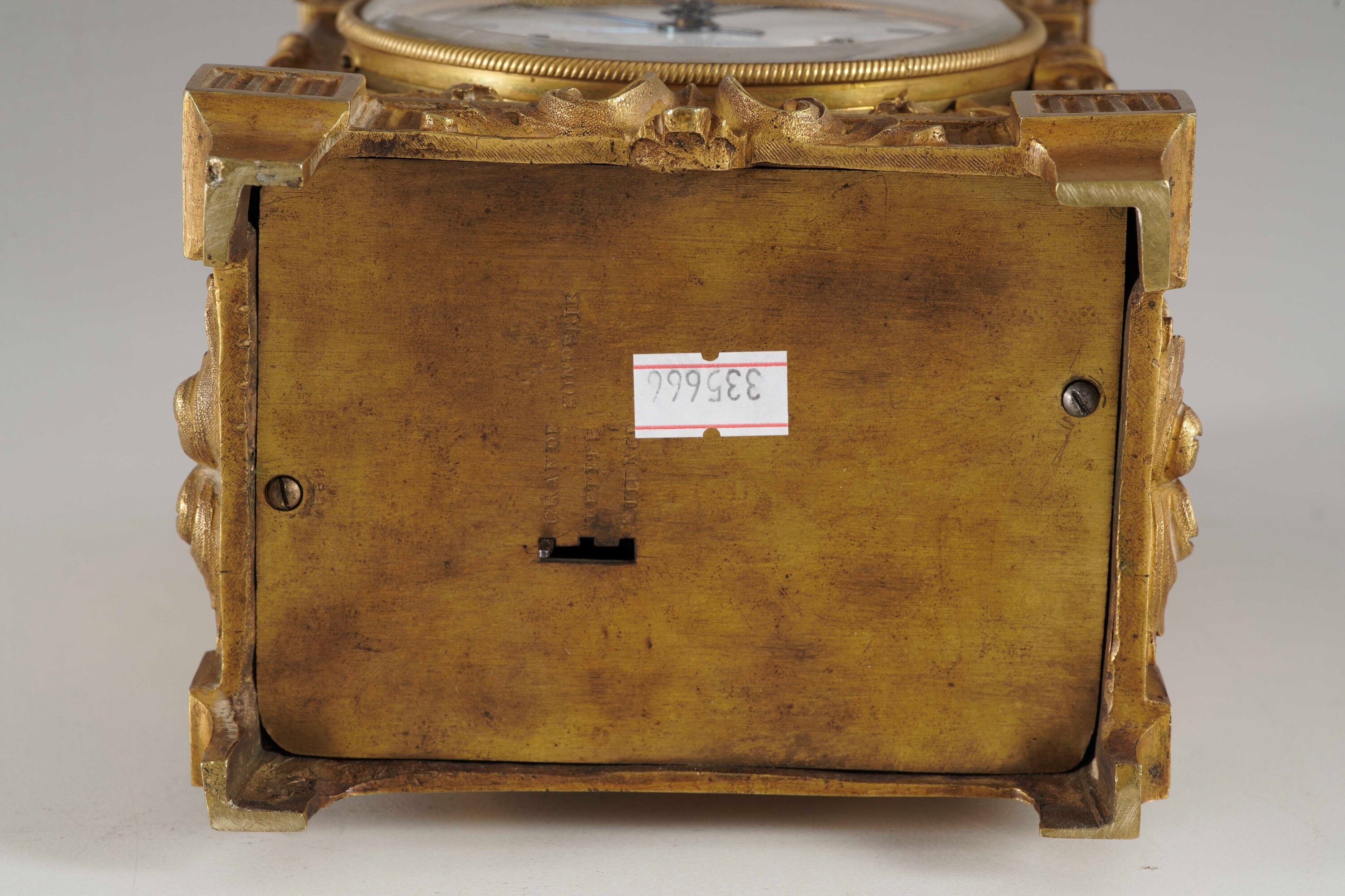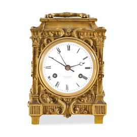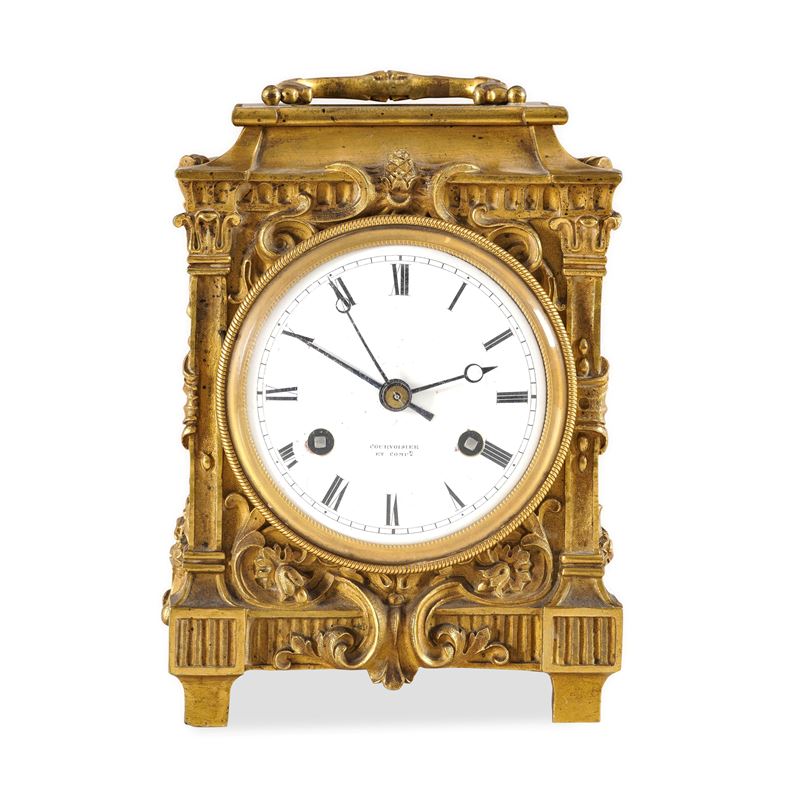 Bronzo dorato. Cassa riccamente decorata a volute vegetali, montanti angolari a colonnina, quadrante in smalto bianco con numeri romani e firma "Courvoisier et Comp.".
