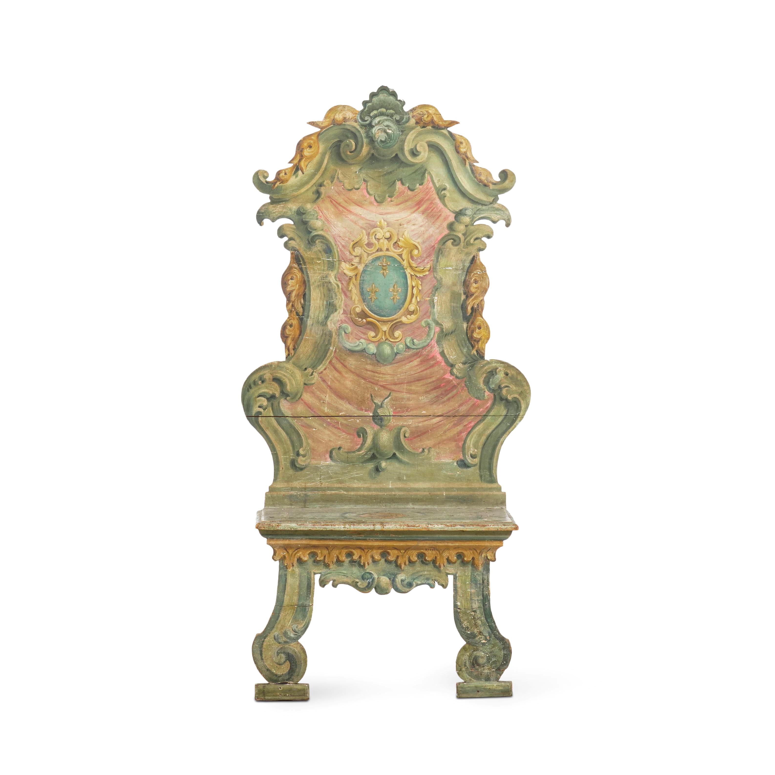 Di forma sagomata con schienale alto, legno laccato a volute, drappi e stemma centrale