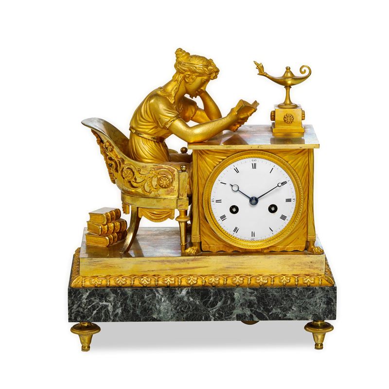 La cassa in bronzo dorato e cesellato raffigura una giovane donna intenta nella lettura, seduta su una poltrona Impero finemente lavorata, illuminata dalla luce di una lampada ad olio poggiata sul tavolo sostenuto da zampe di leone e coperto da un finto drappo sul quale è montato l'orologio. Quadrante in smalto bianco con numeri romani. Base in marmo su piedini a trottola