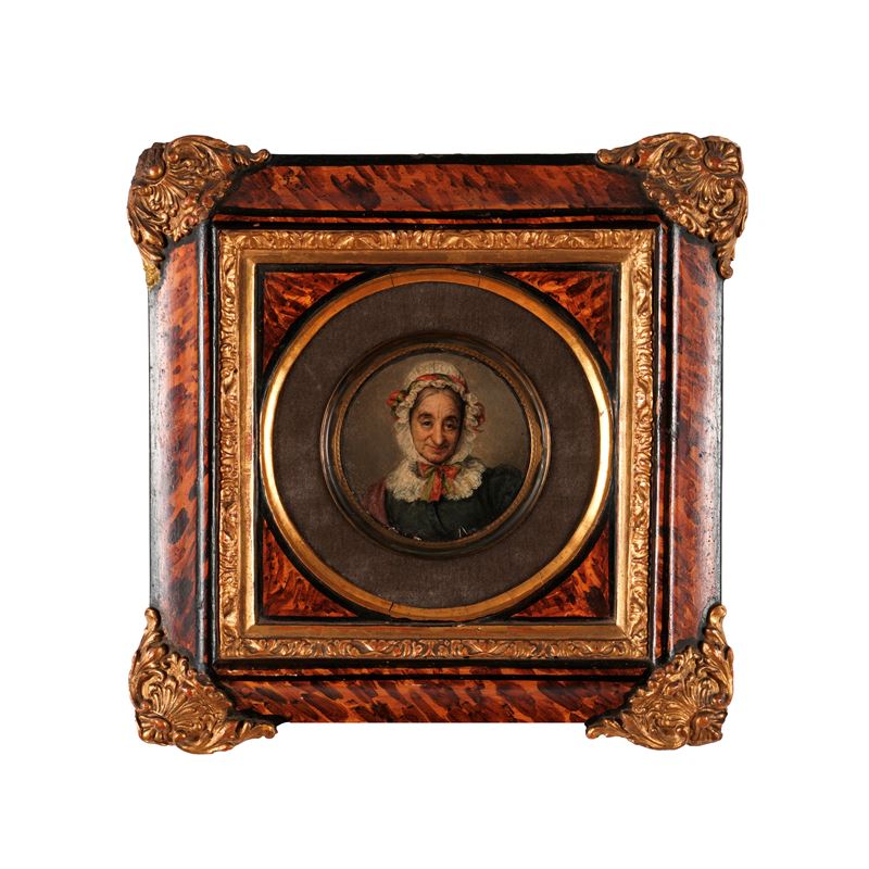 miniatura circolare su carta, in cornice coeva dipinta a finta tartaruga con angoli dorati.