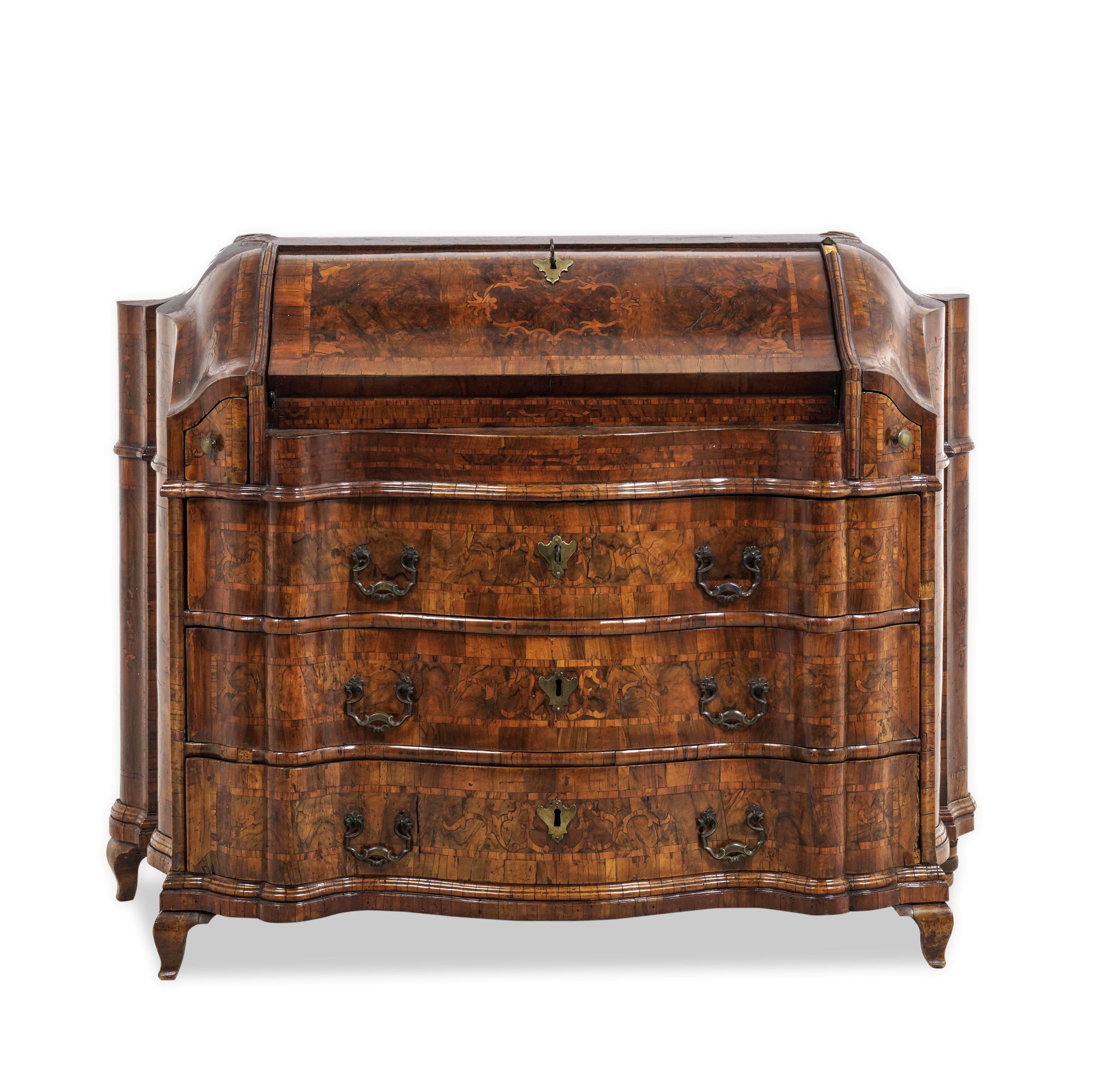 Lastronata in noce e radica di noce, fronte e fianchi mossi, tre cassetti sormontati da scarabattolo con cassettini, anta centrale e vani segreti