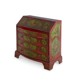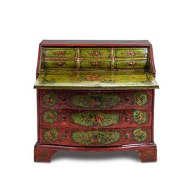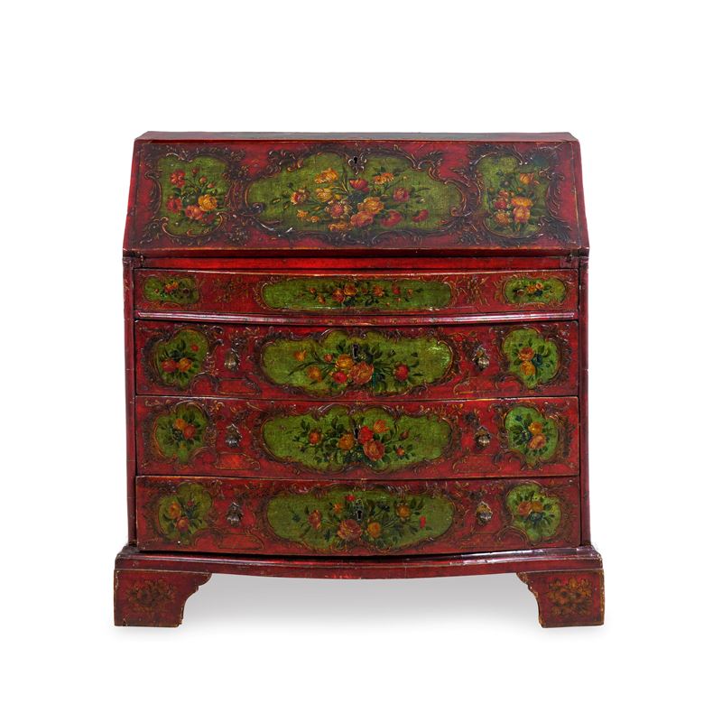 Legno laccato e dipinto, fronte mosso a tre cassetti e un mezzo cassetto, scarabattolo che cela cassettini mossi, decoro in pastiglia e a rilievo con riserve sagomate e bouquet di fiori (laccatura moderna su scafo antico)