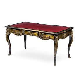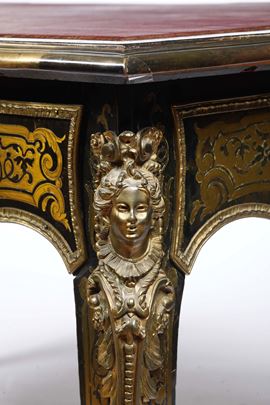Legno ebanizzato decorato in stile Boulle, fascia dotata di tre cassetti, gambe mosse con applicazioni decorative a foggia di erma femminile in bronzo dorato, piano sagomato con bordo in bronzo dorato e rivestimento in cuoio rosso