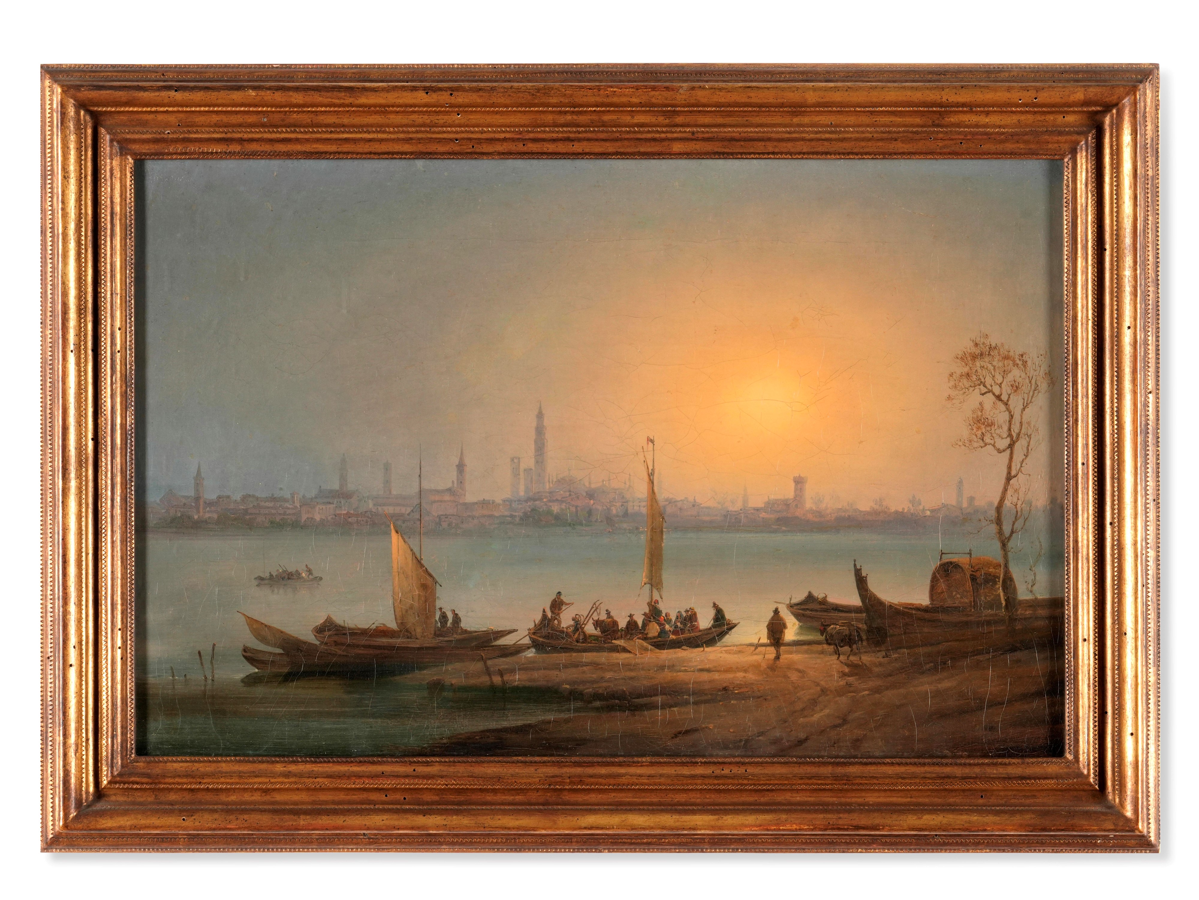 Scuola del XIX secolo Veduta costiera con pescatori e imbarcazioni