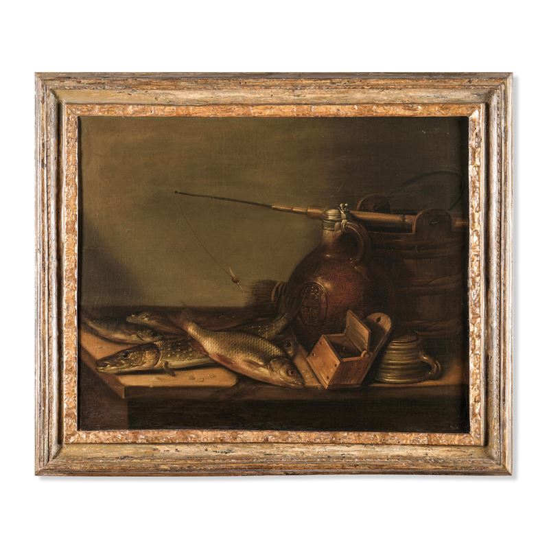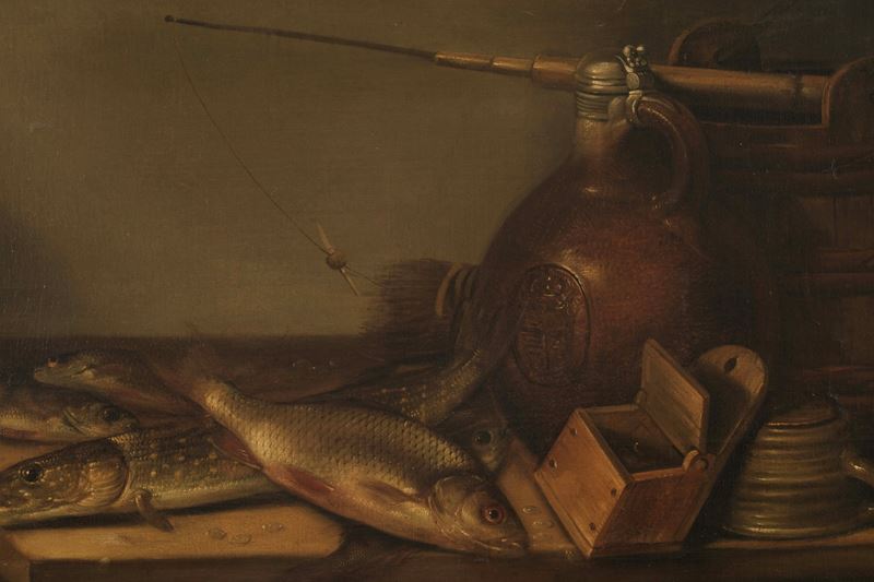 Scuola del XVIII secolo Natura morta con pesci e vasellame