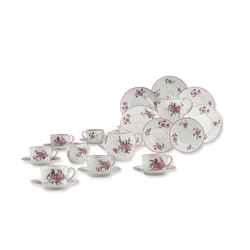 Il servizio conta 37 pezzi ed è così composto: 17 tazze con 18 piattini (un piattino con sbeccatura al bordo); 17 piatti da dessert; 1 teiera (sbeccature al coperchio); 1 lattiera; 1 zuccheriera (coperchio rotto in due frammenti e incollato)
