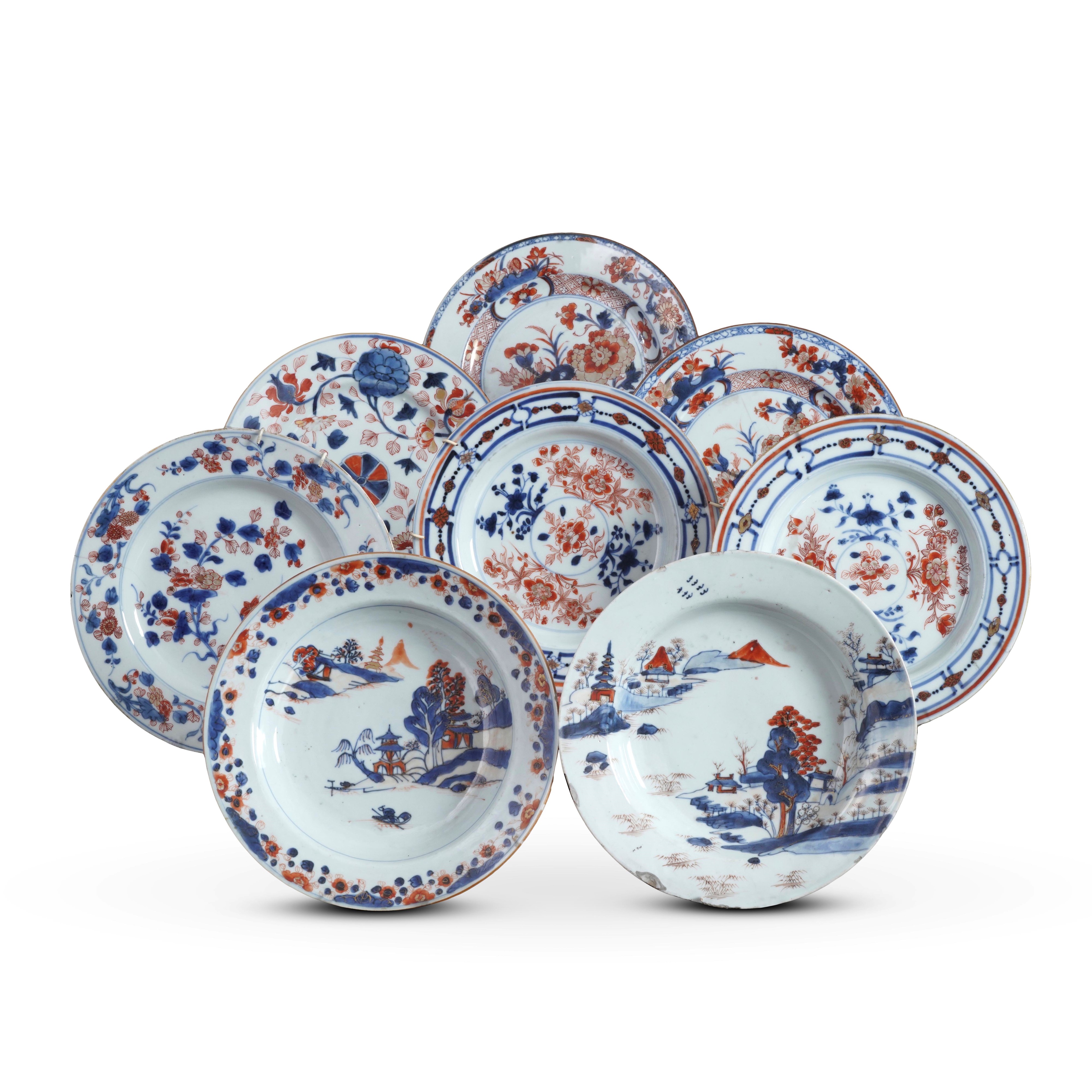 Servizio in porcellana composto da otto piatti stile Imari raffigurante scena di paesaggio con decori floreali, Giappone, XIX secolo
