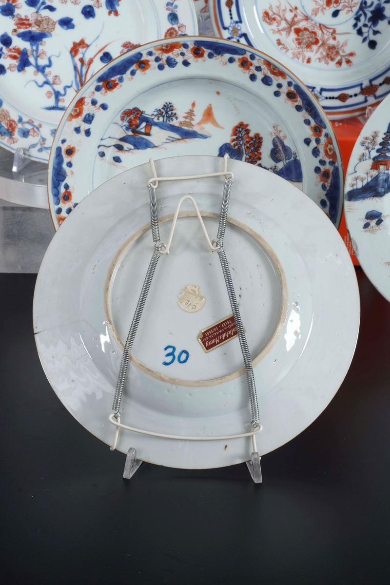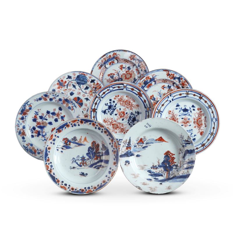 Servizio in porcellana composto da otto piatti stile Imari raffigurante scena di paesaggio con decori floreali, Giappone, [..]