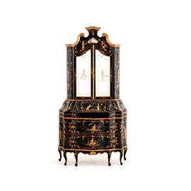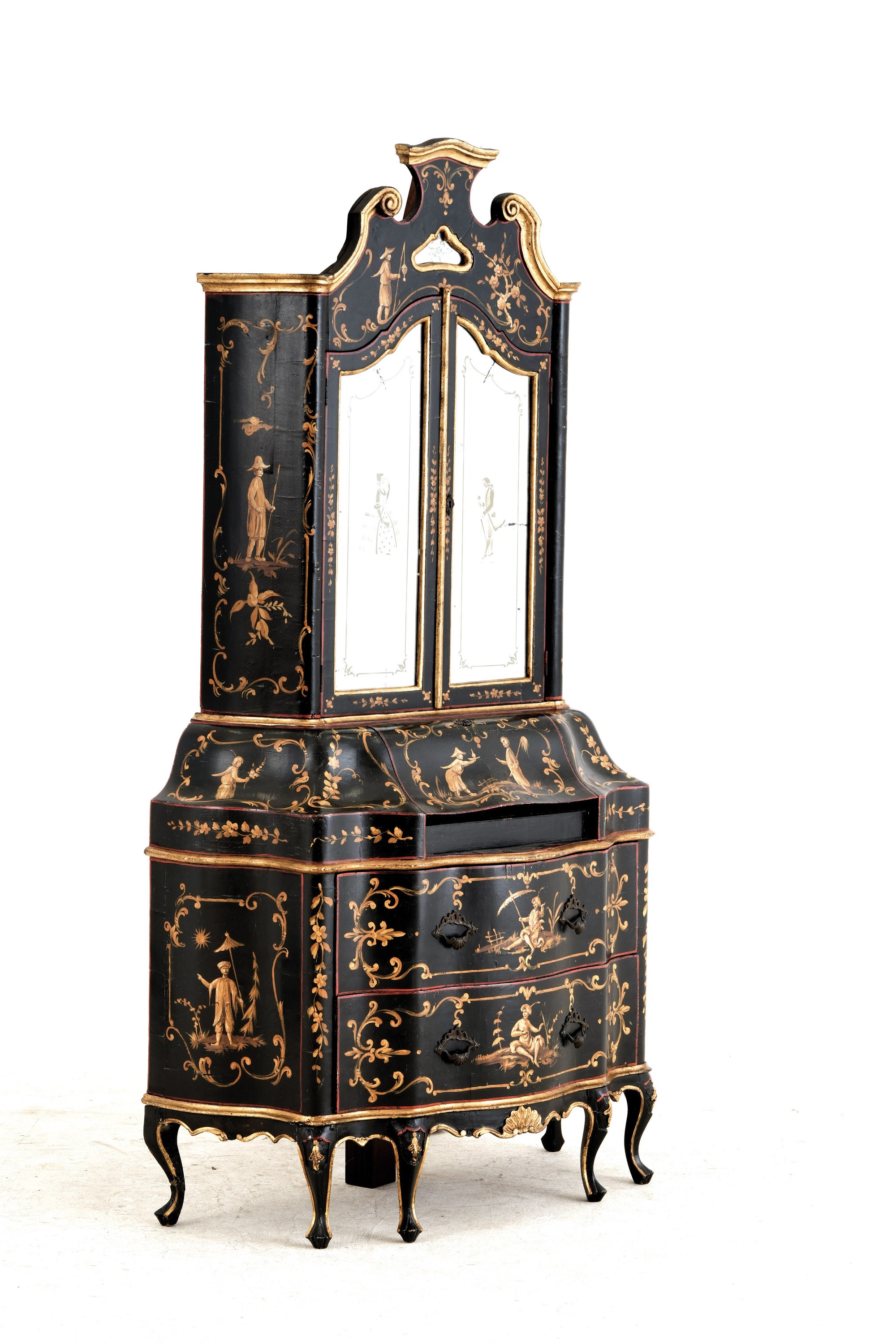 Legno intagliato e dorato, laccato a chinoiseries e figure entro riserve fogliacee, specchi incisi con personaggi in costume