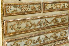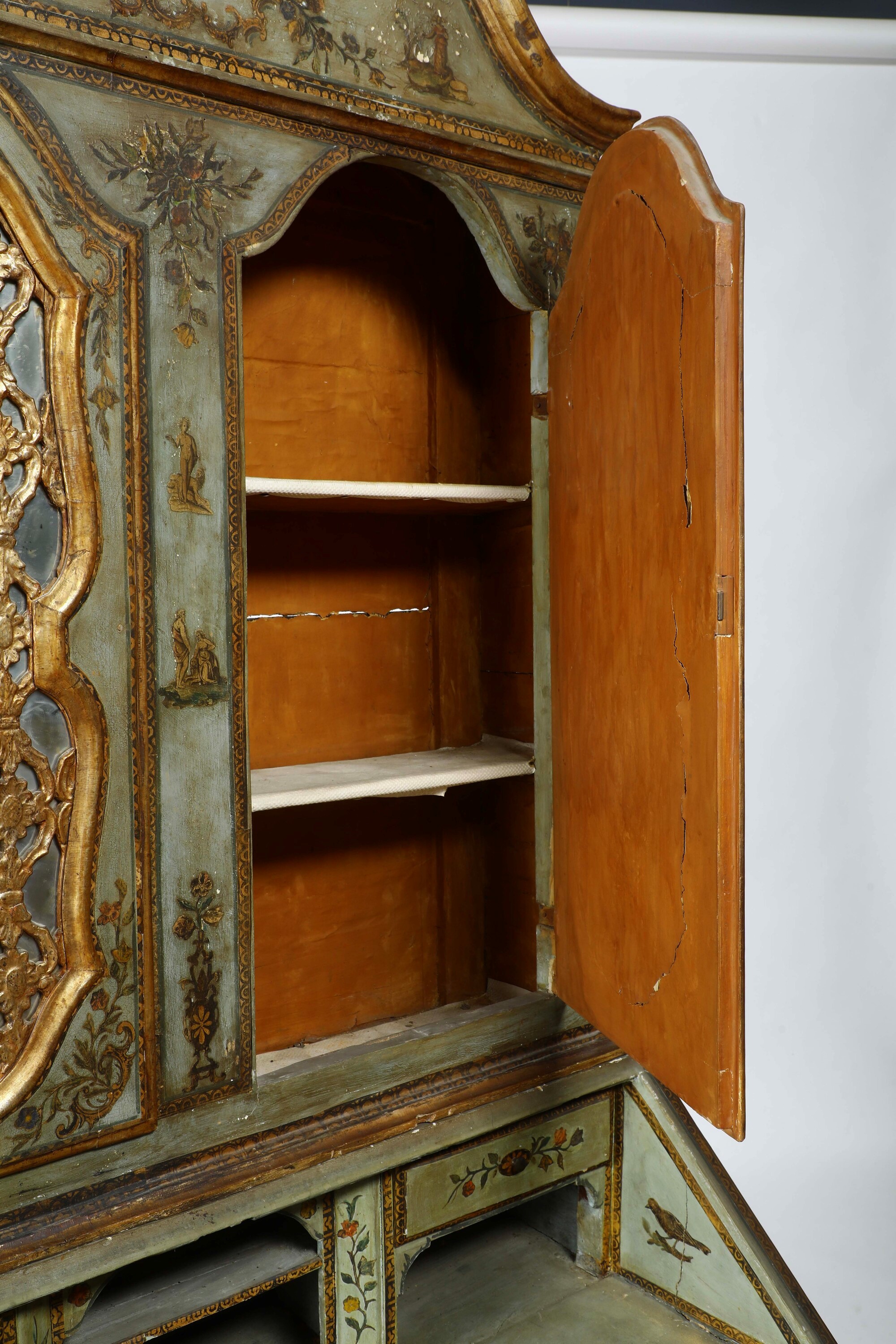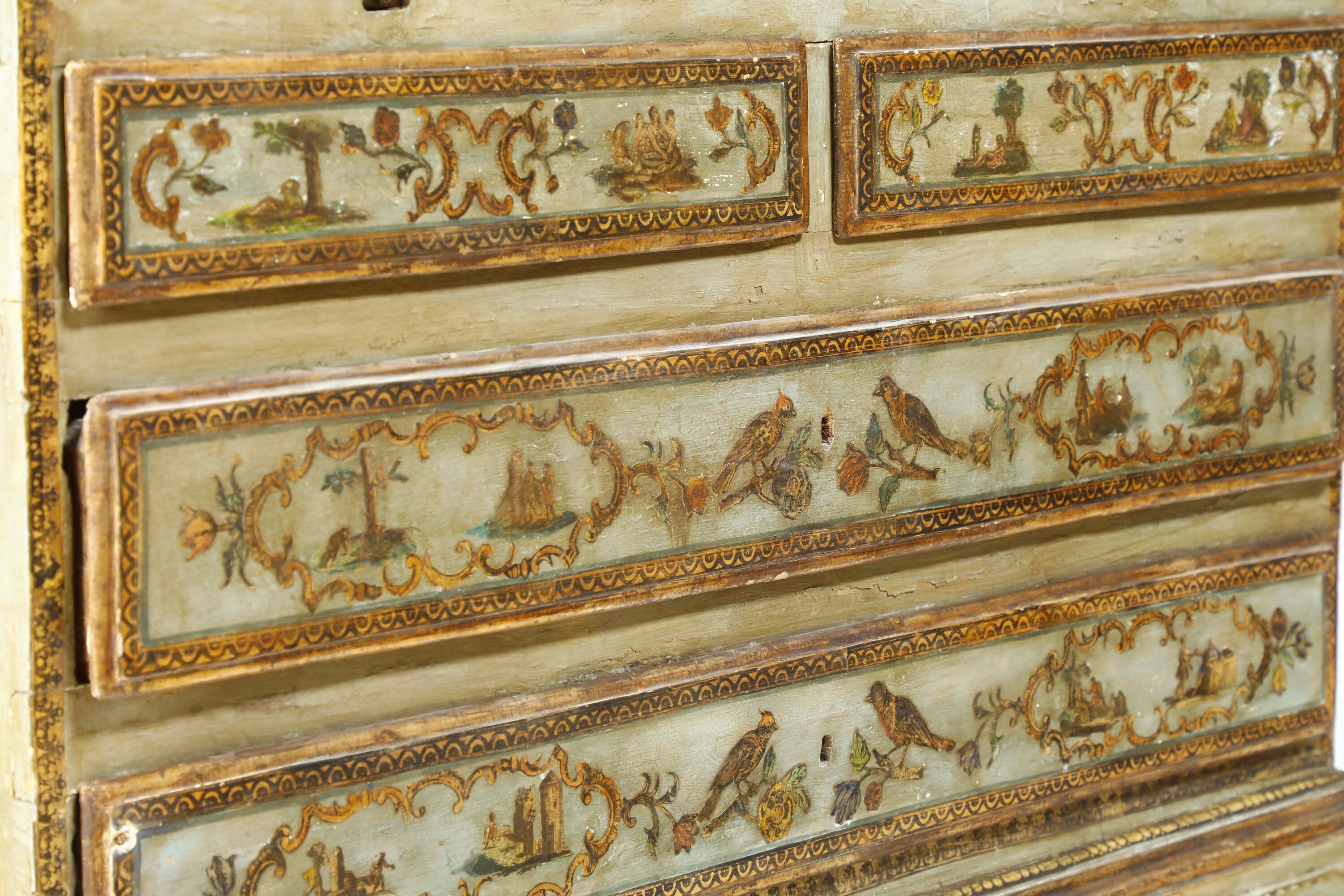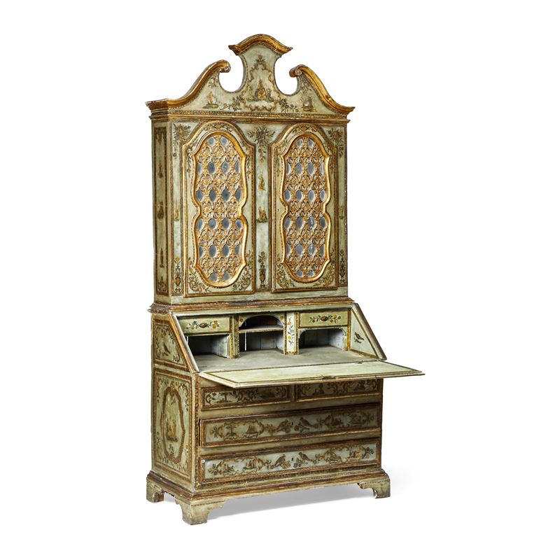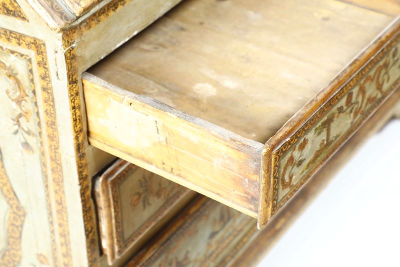Laccato e decorato ad arte povera, impreziosito da profili dorati. Fronte a due cassetti e due cassettini affiancati sormontati da ribalta che cela scarabattolo. Alzata a due ante sagomate con cappello dalla linea spezzata. Ricco decoro con scene di genere, motivi zoomorfi e fitomorfi