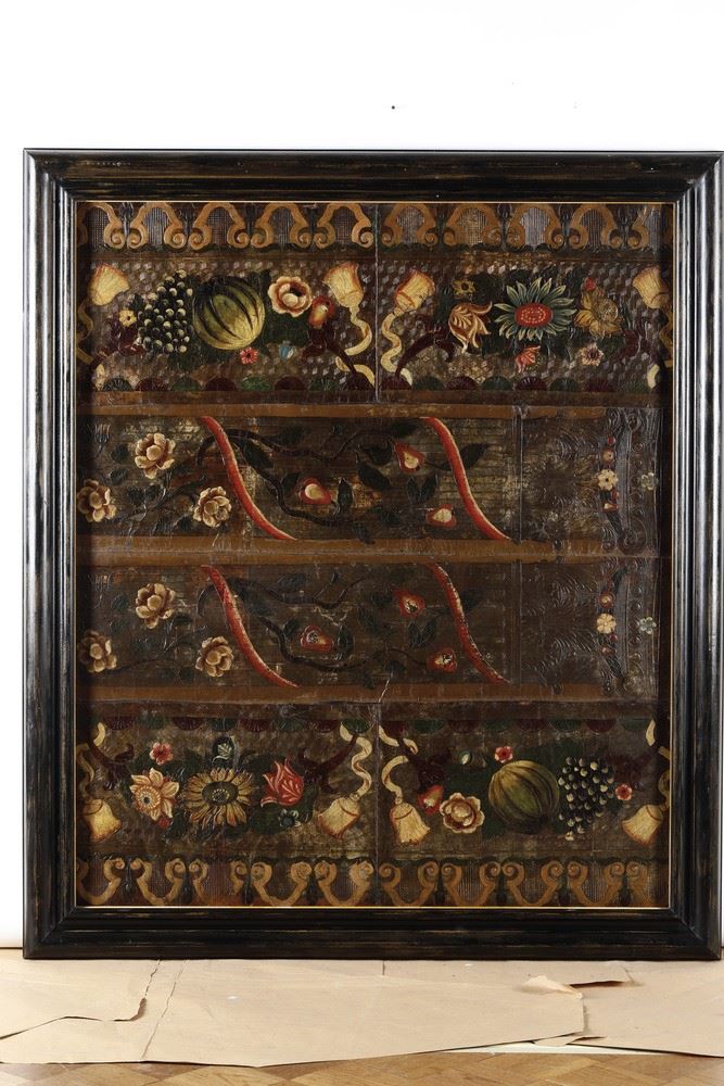 Coppia di pannelli in cuoio decorati con motivi vegetali e floreali