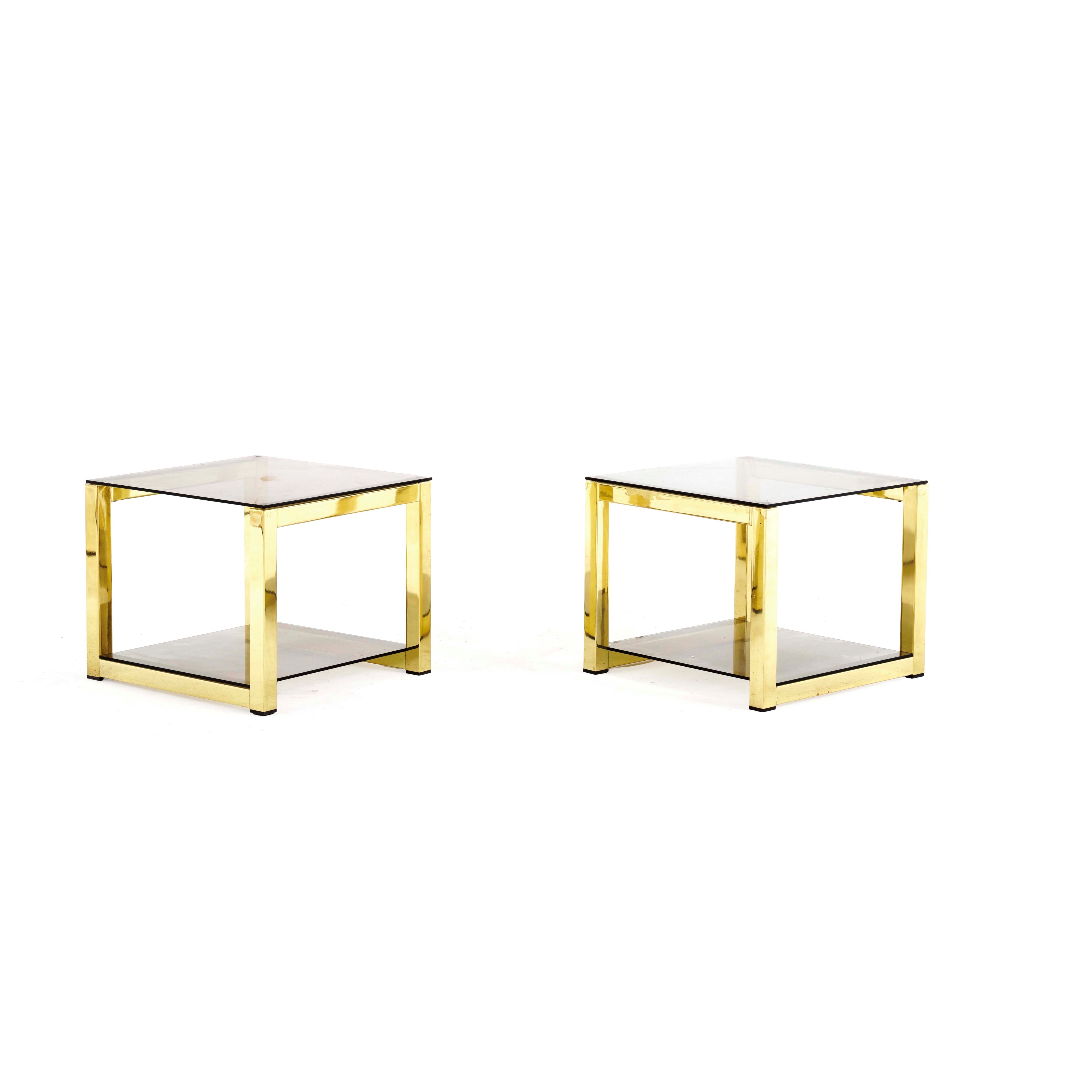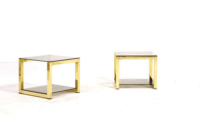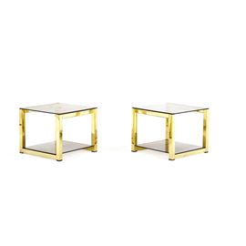 Coppia di tavolini in metallo dorato a due ripiani a vetro