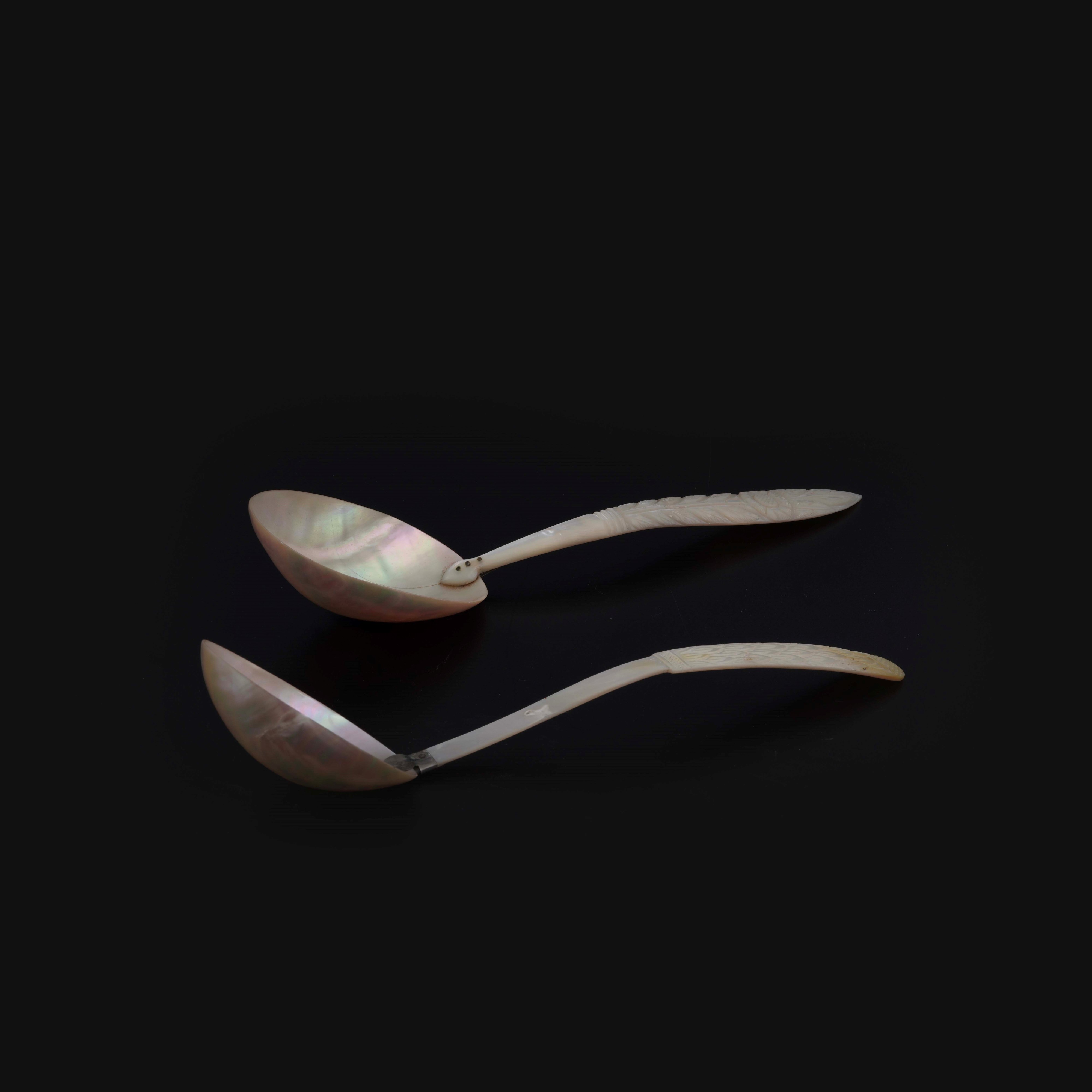 Due cucchiaini da portata in madreperla incisa. XIX secolo