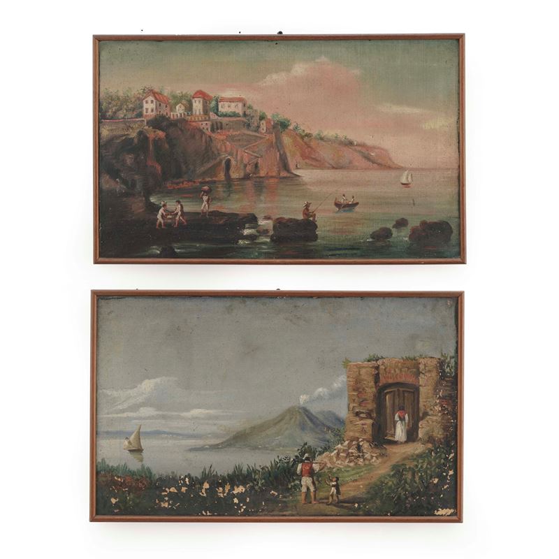 Due dipinti raffiguranti scene costiere con personaggi. XX secolo
