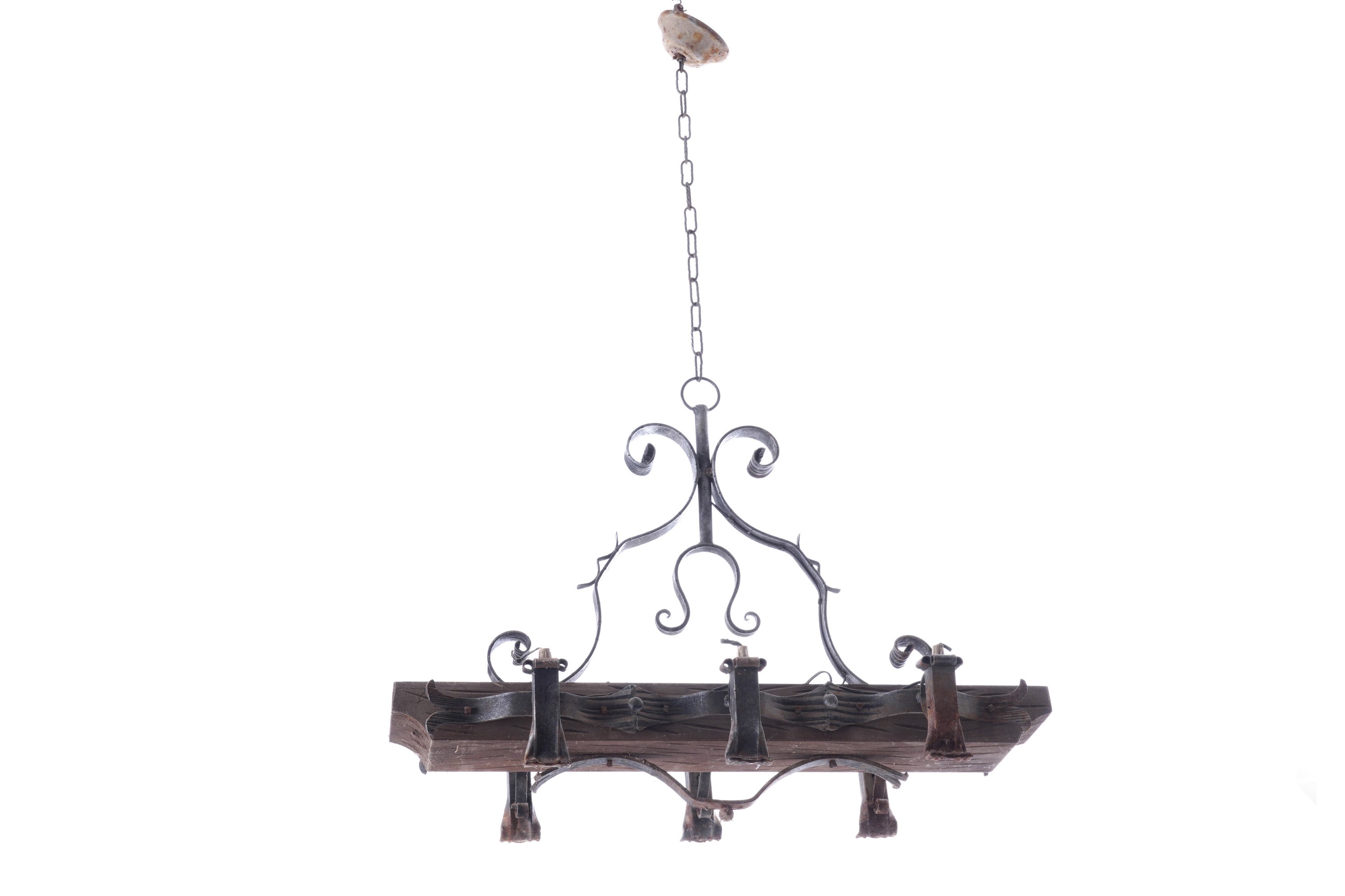 Due lampadari in ferro e legno a cinque luci e sei luci