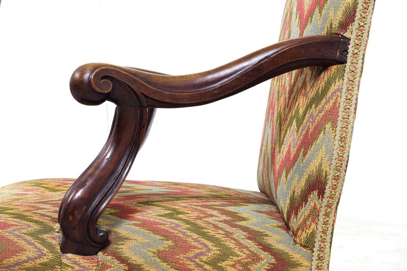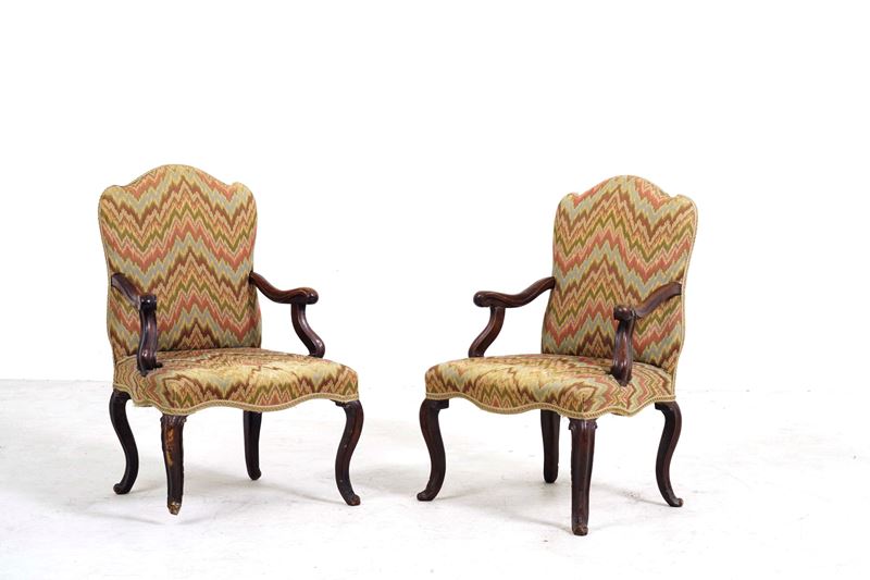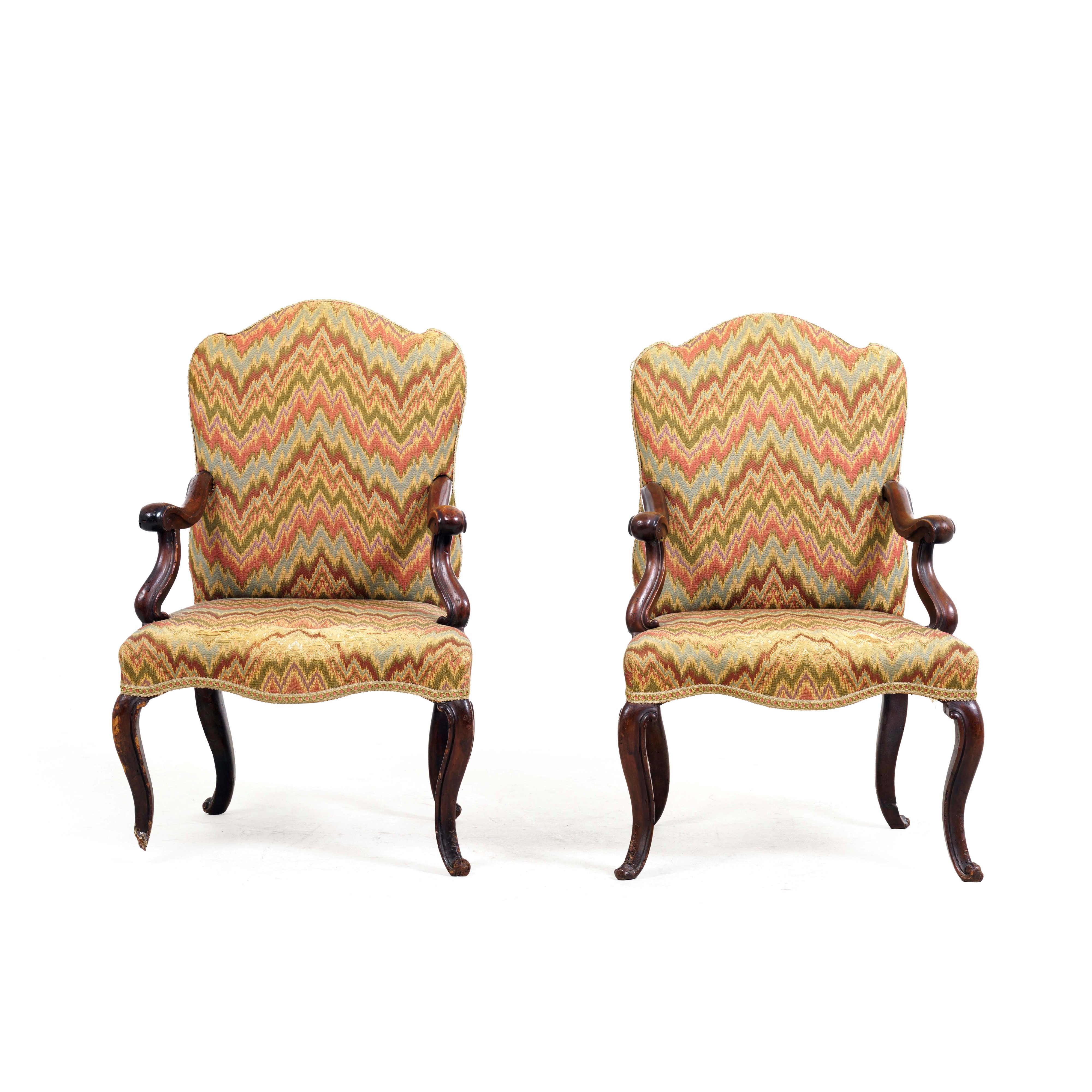 Due poltrone in noce con tessuto fiammato. XVIII secolo