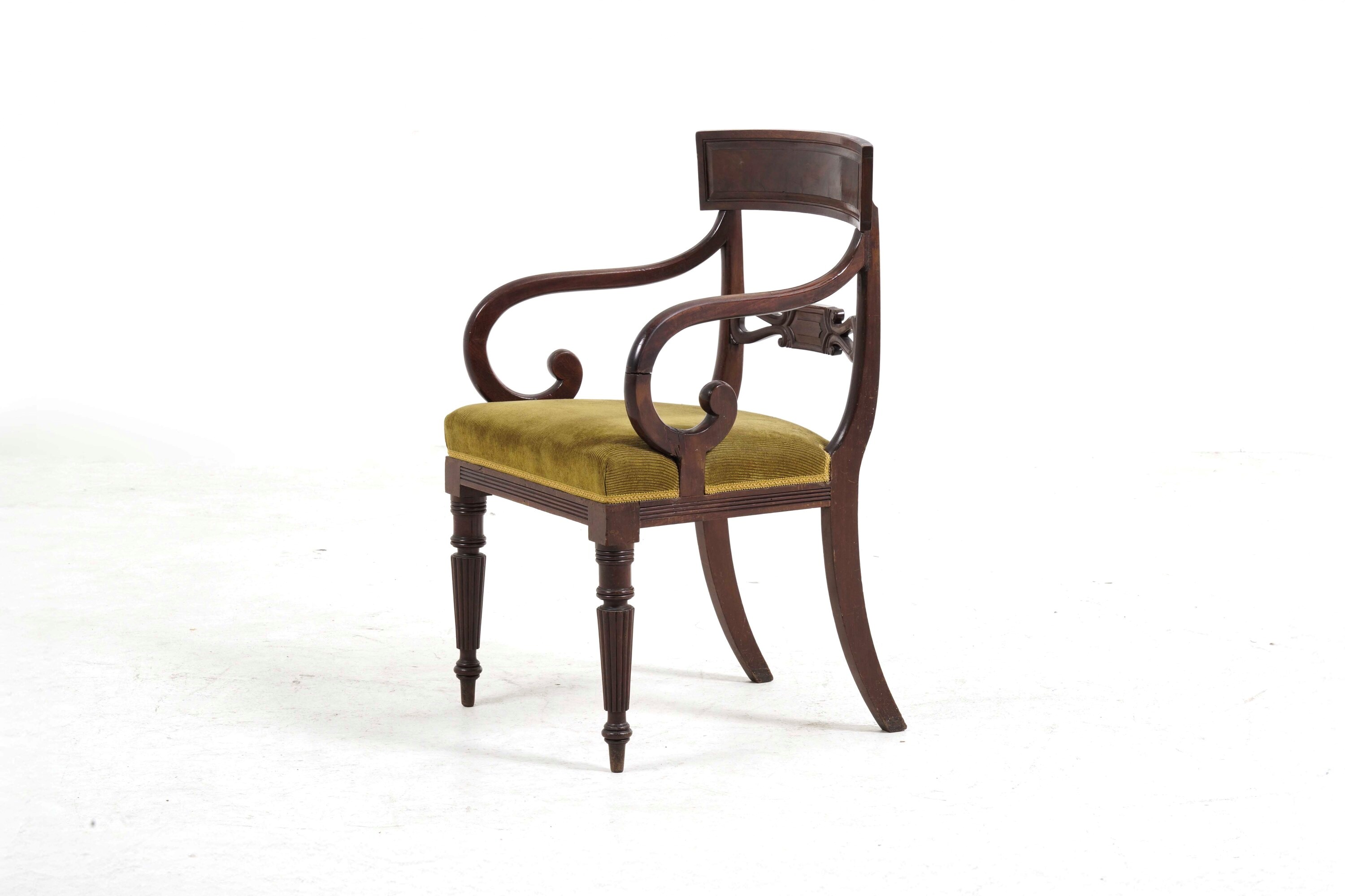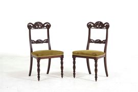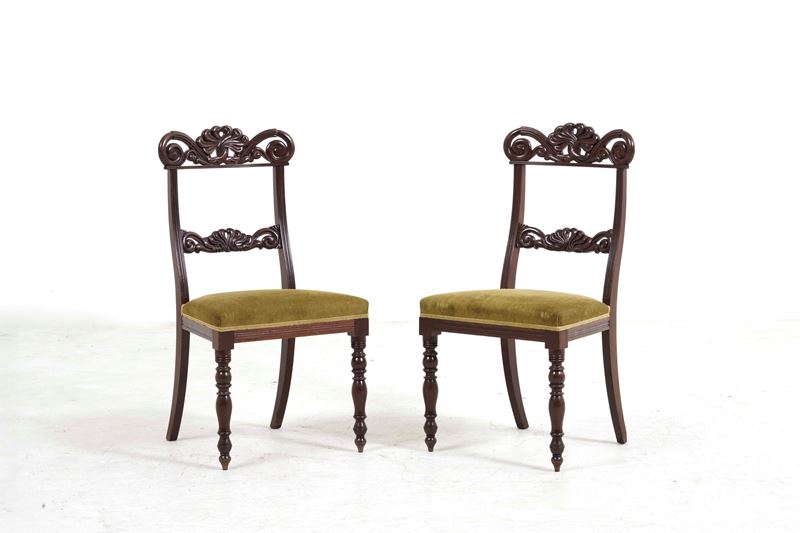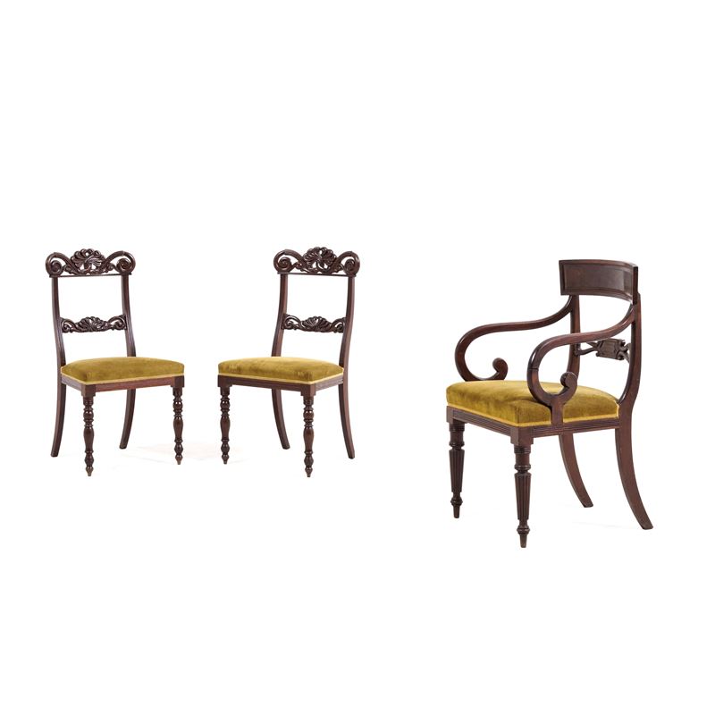 Due sedie e una poltrona in legno intagliato. XIX secolo