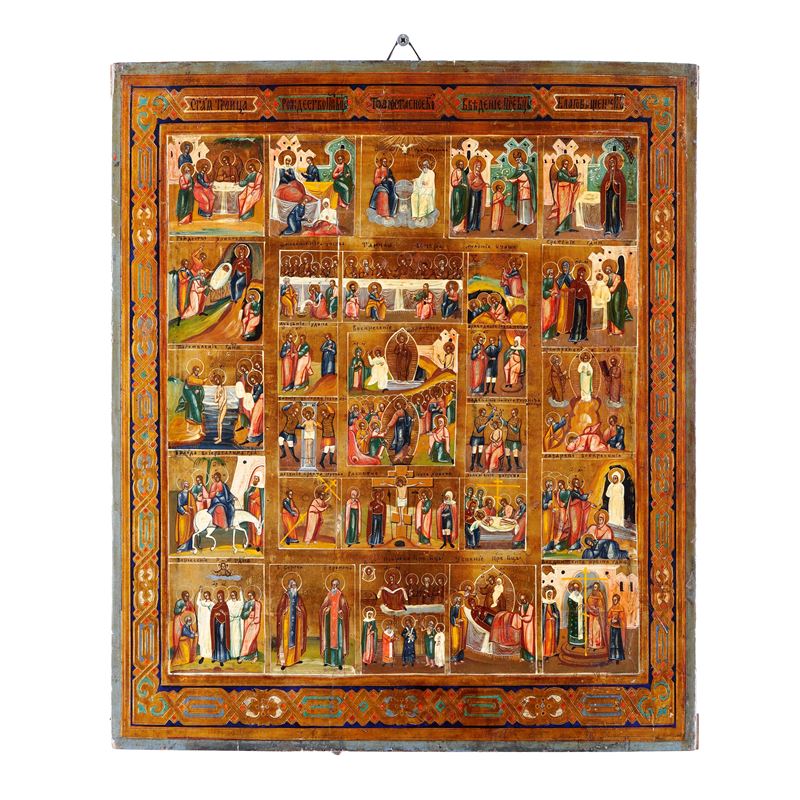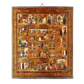 Icona tempera su tavola raffigurante la Passione e Resurrezione con le 16 feste. Russia XIX secolo