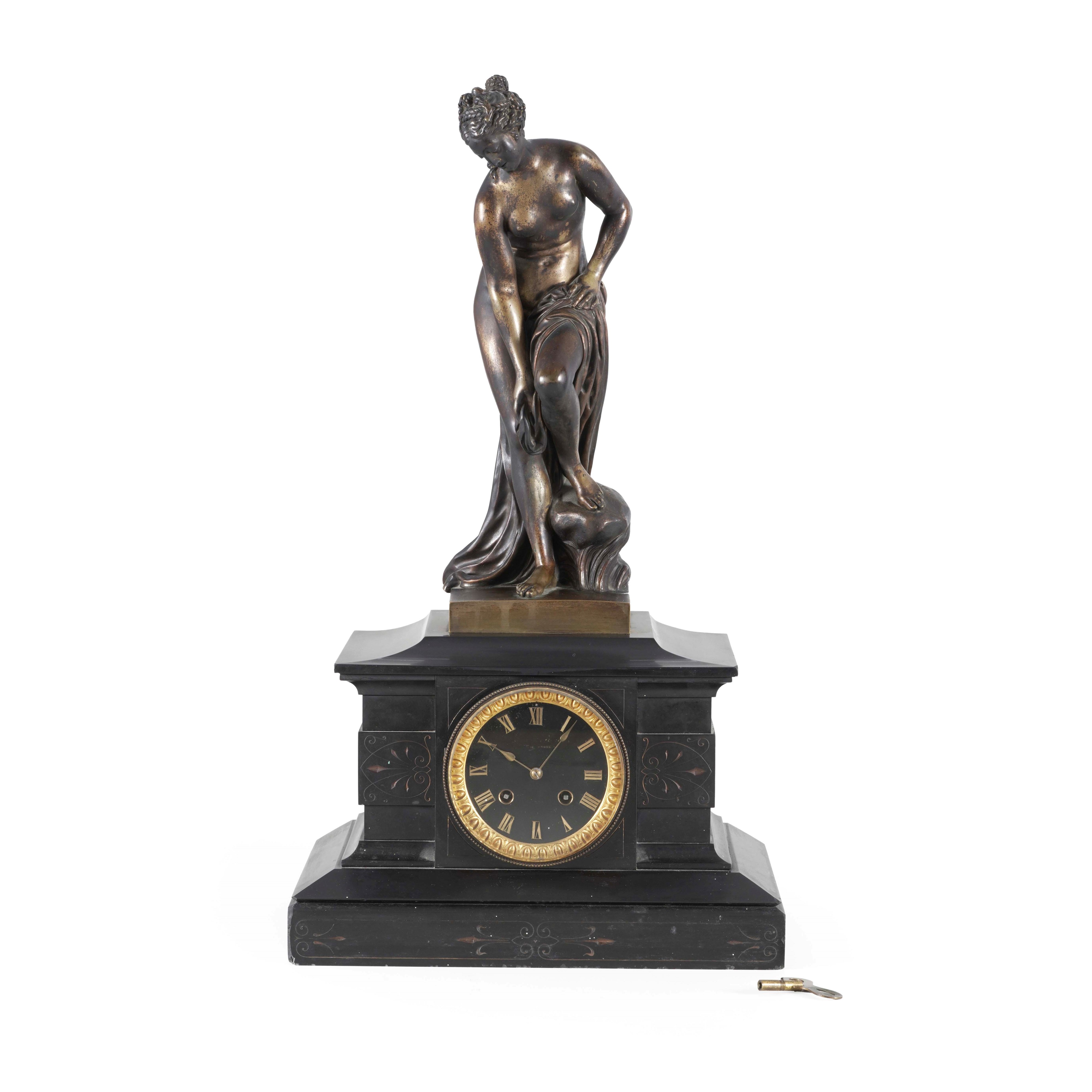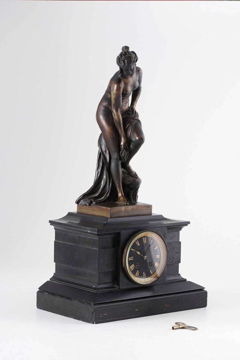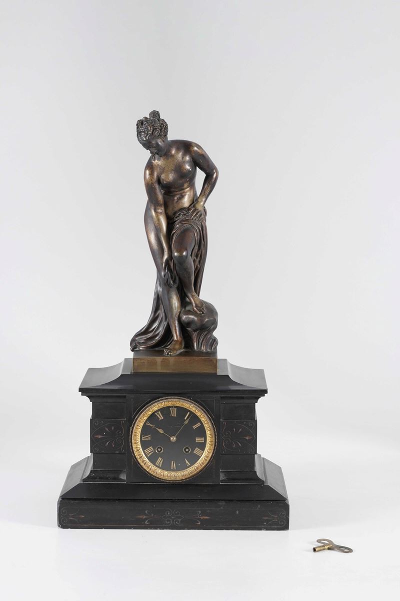 Orologio da appoggio con cassa in marmo nero sormontata da figura di Venere in bronzo. XX secolo