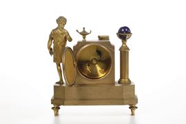 Base con panoplia, ai lati della cassa fanciullo che legge e globo celeste laccato lapislazulo, quadrante in smalto bianco con numeri romani