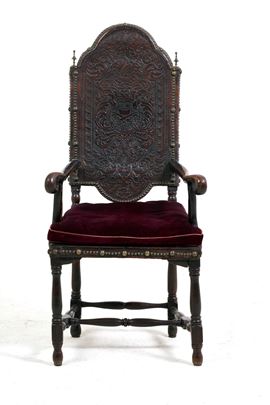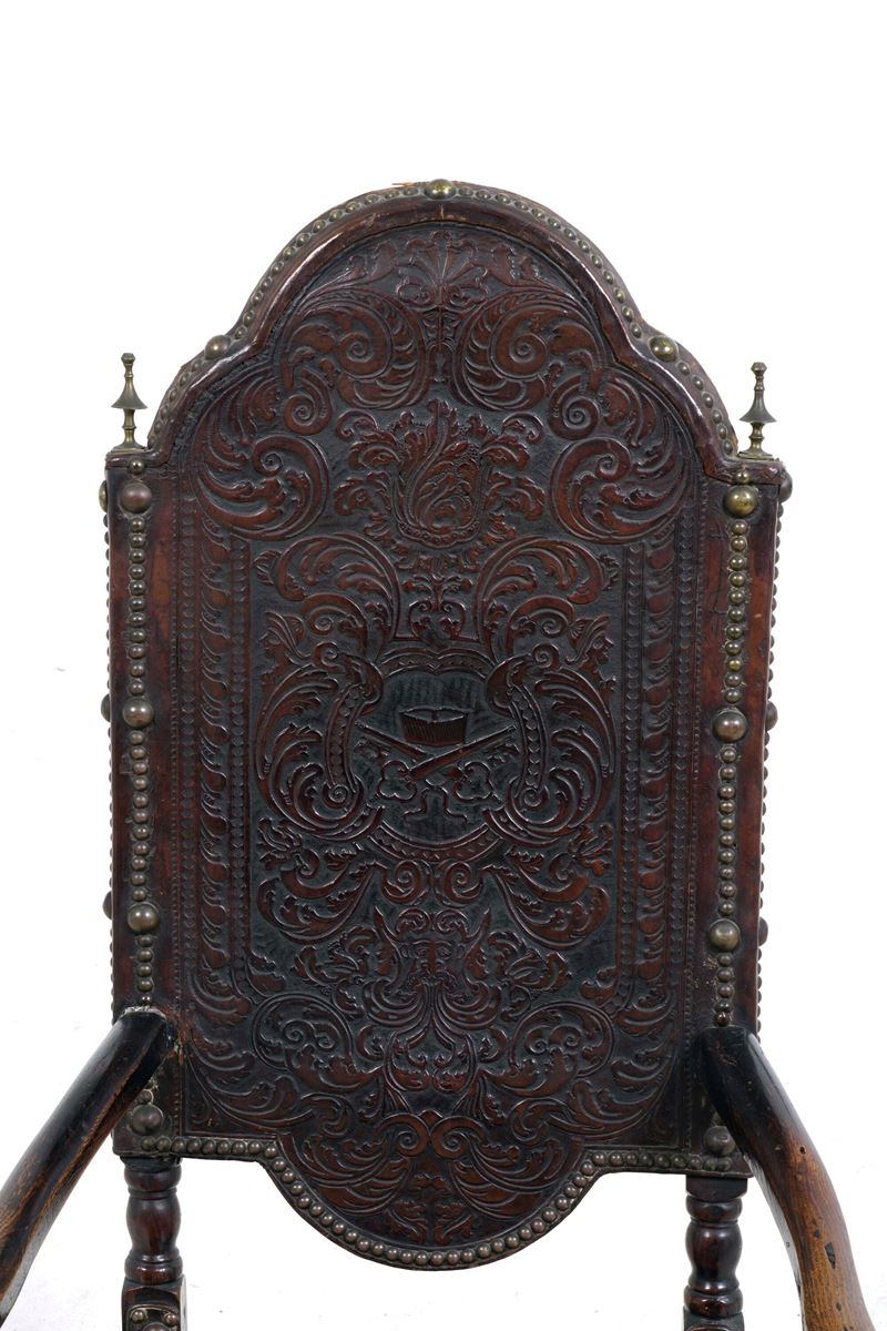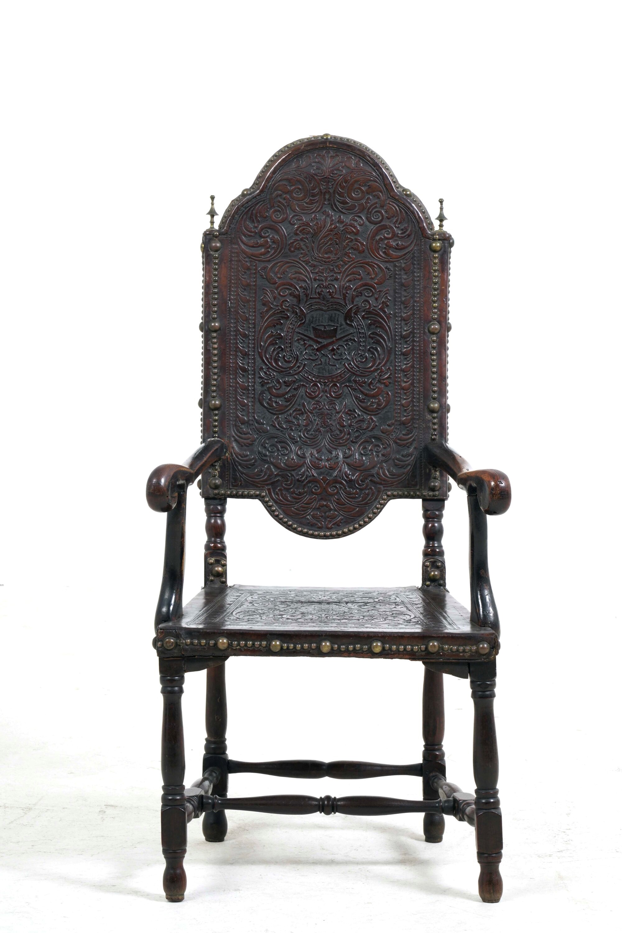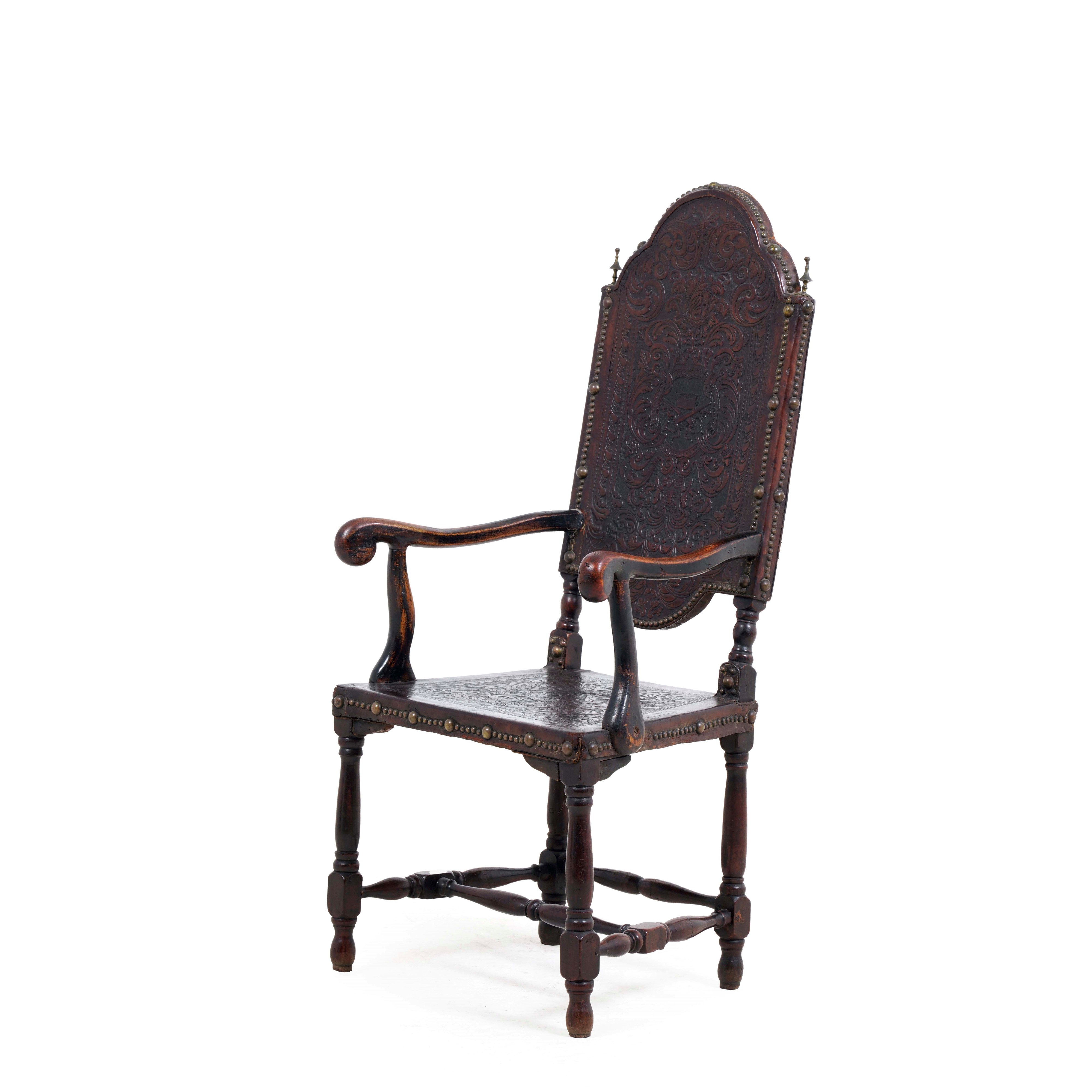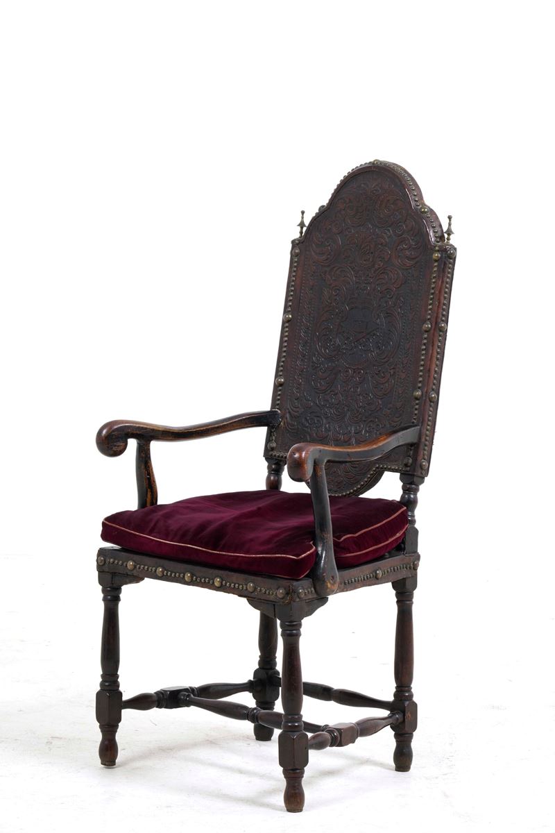 Poltrona in noce con schienale e seduta in cuoio. Francia, XIX secolo