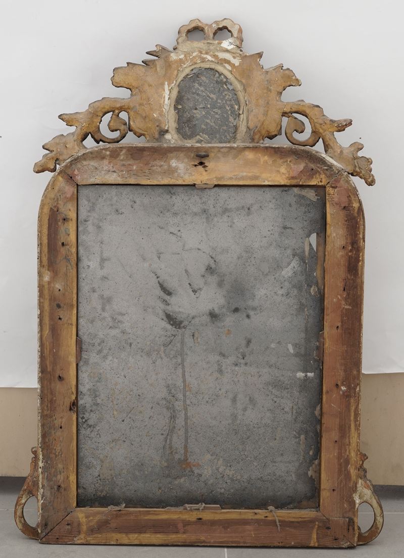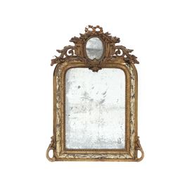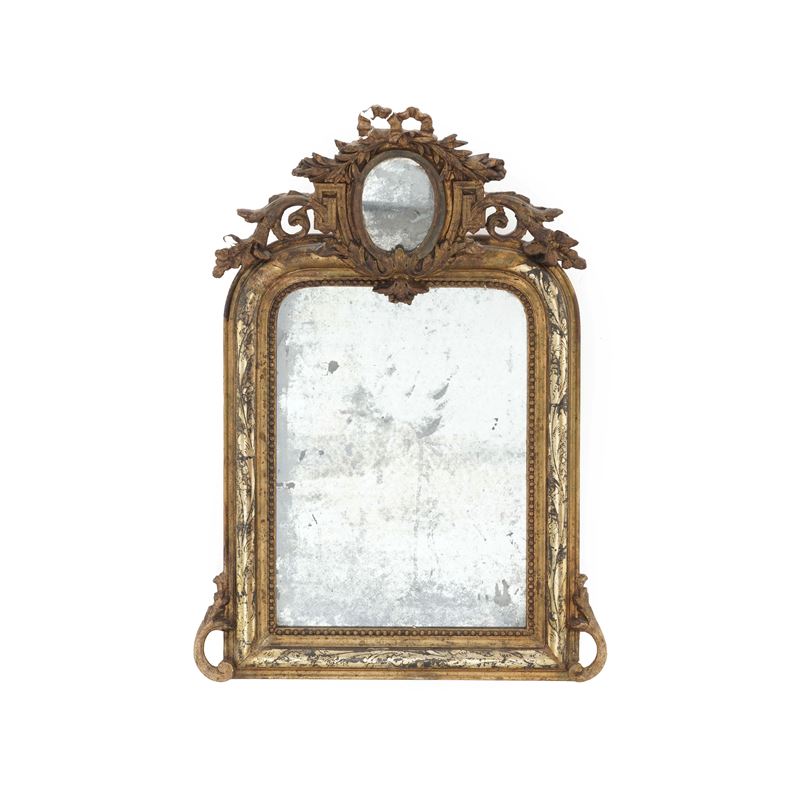 Specchiera in legno dorato con cimasa centrata da specchietto ovale Francia, stile Luigi XVI, XX secolo