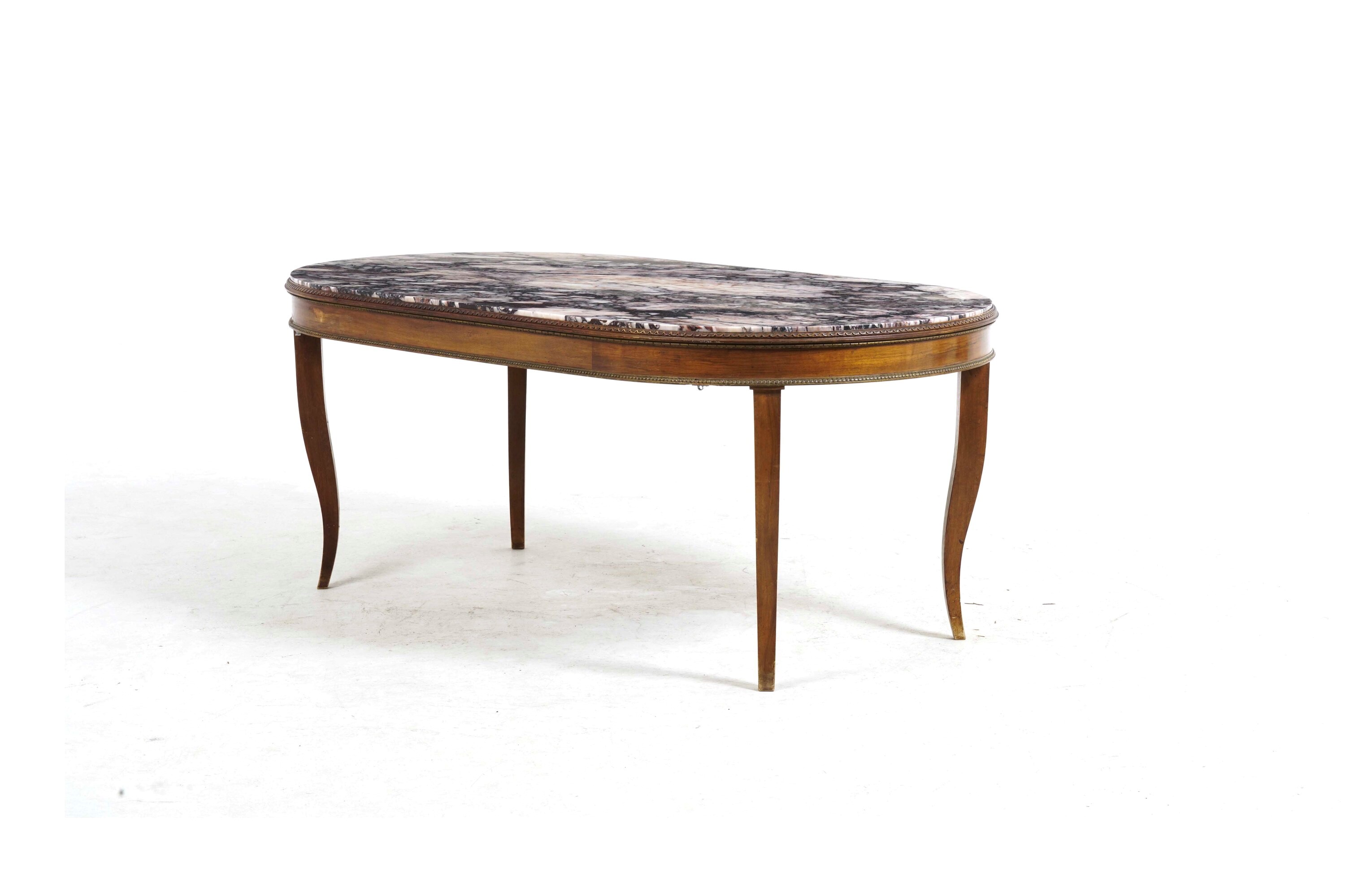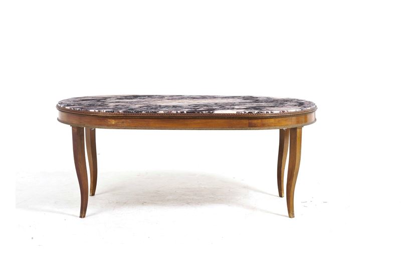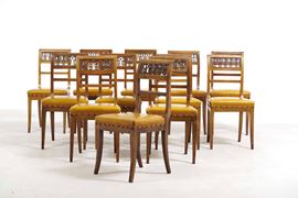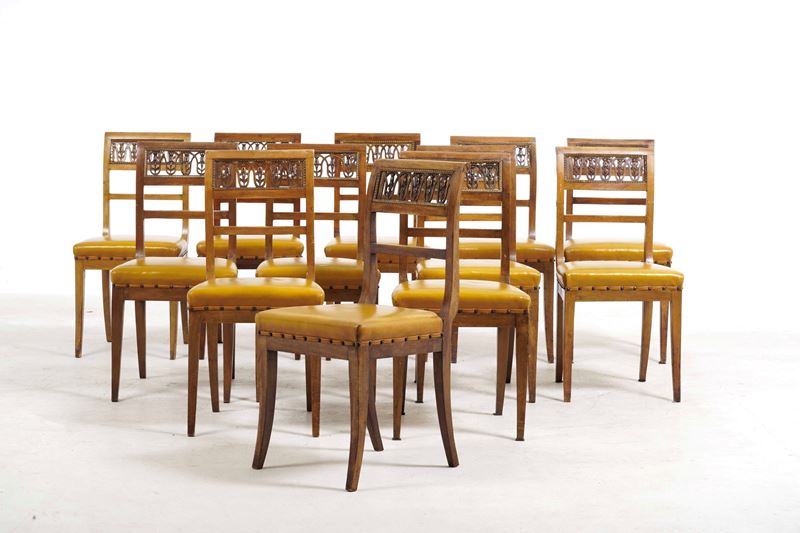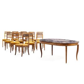 Tavolo da pranzo ovale con piano in marmo fior di pesco e dodici sedie in stile Impero