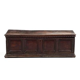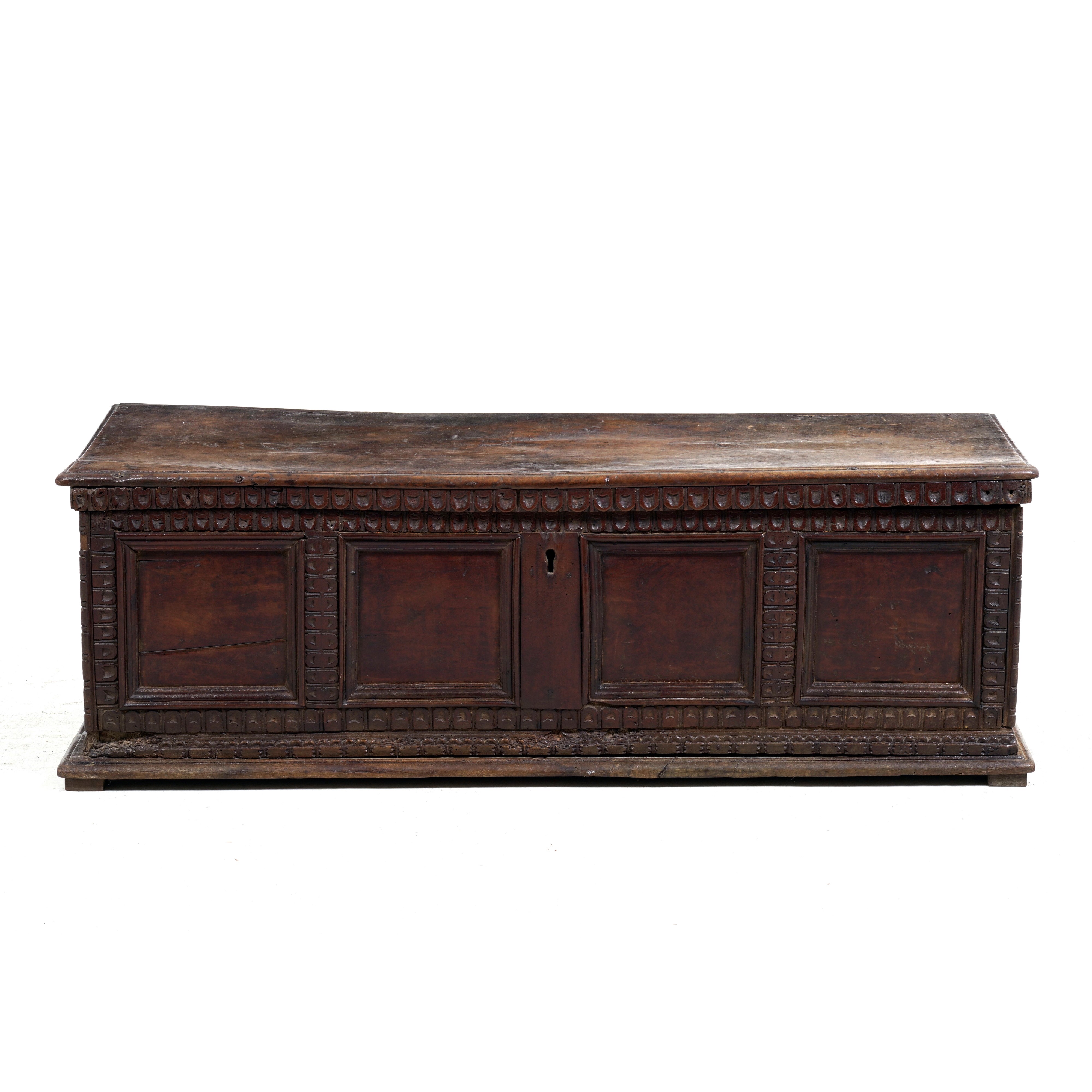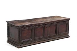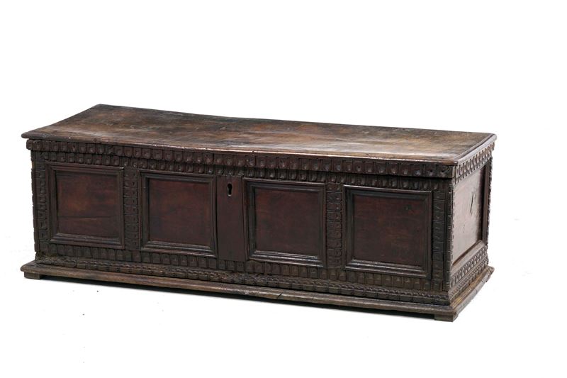 Cassapanca in noce con parte frontale a quattro riquadri. Italia centrale, XVIII secolo