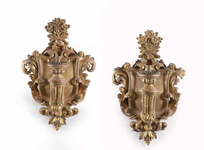 Coppia di appliques in legno intagliato e dorato. XVIII secolo