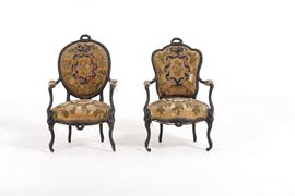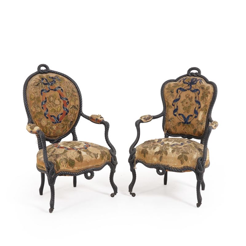 Due poltrone in legno ebanizzato ed intagliato a torciglione, XVIII secolo