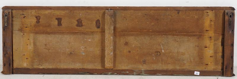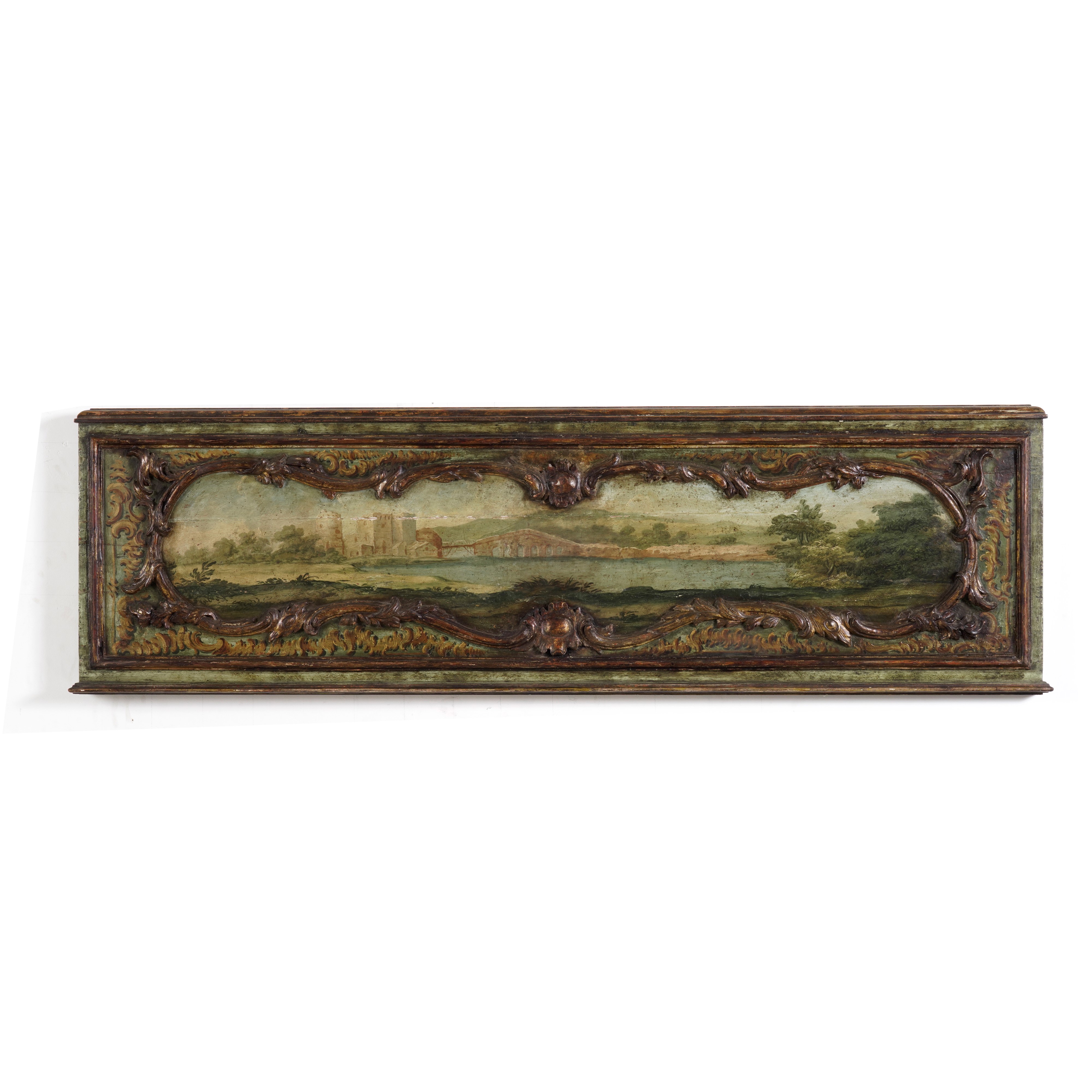 Fregio in legno intagliato dipinto e dorato con paesaggio. XVIII secolo