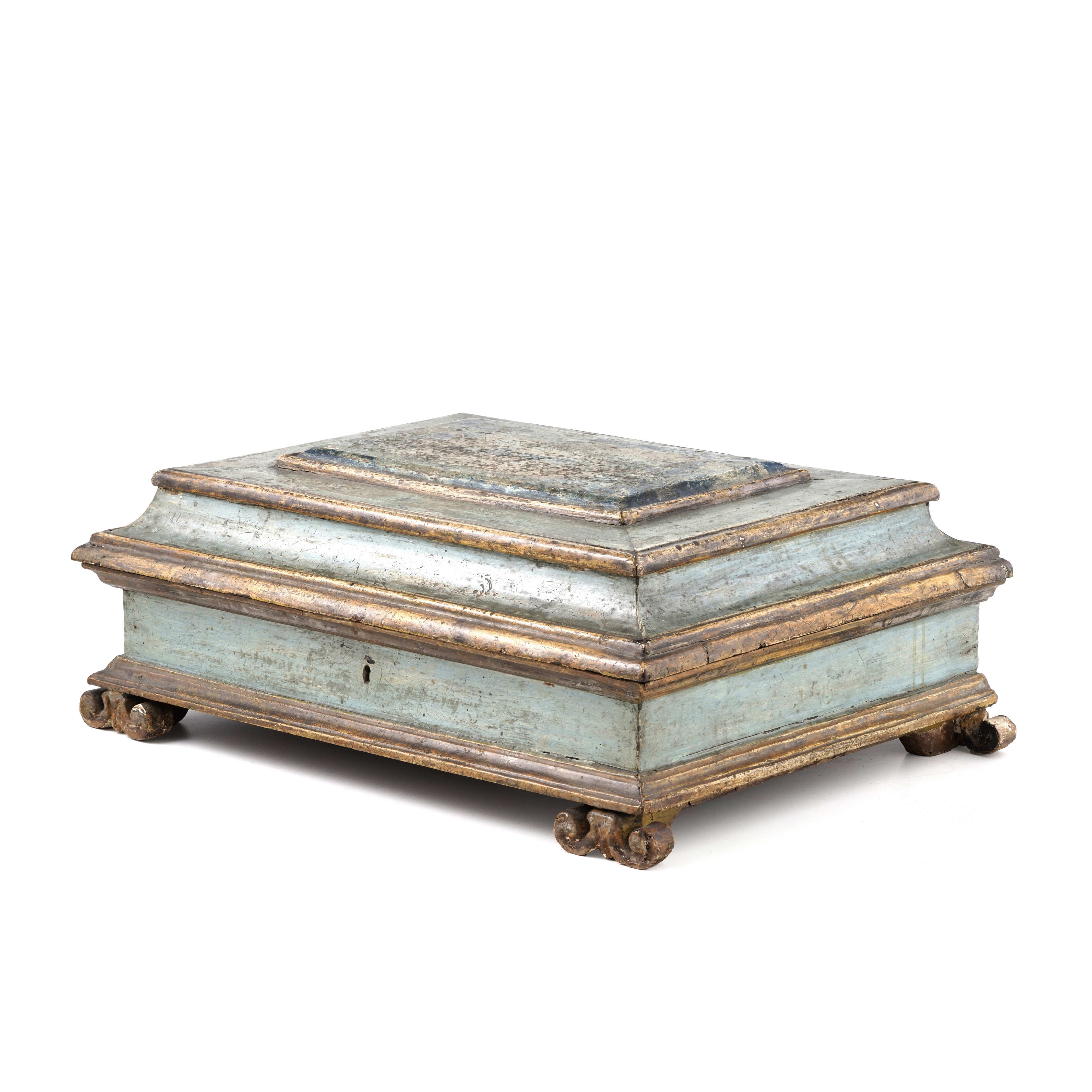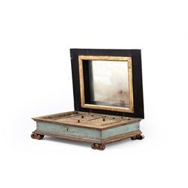 Scatola da cucito in legno laccato, dipinto e dorato, all’interno vari scomparti. Italia centrale, XVIII secolo