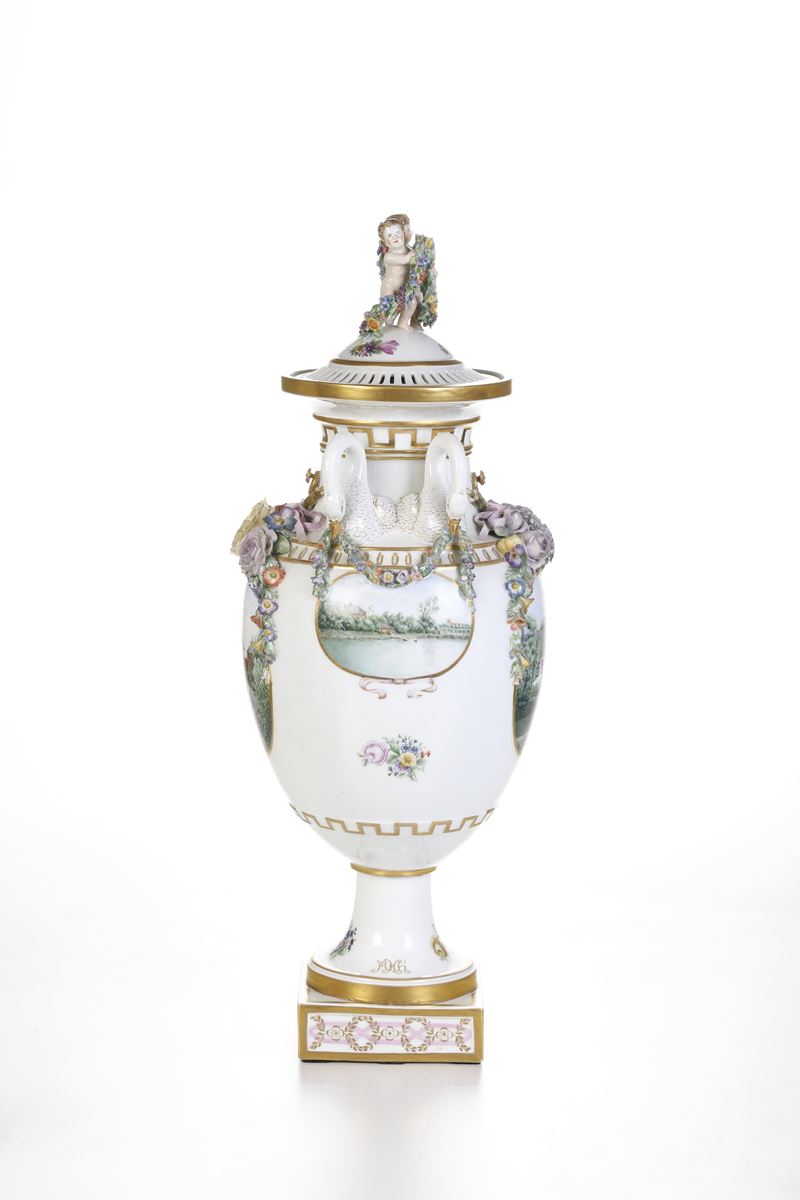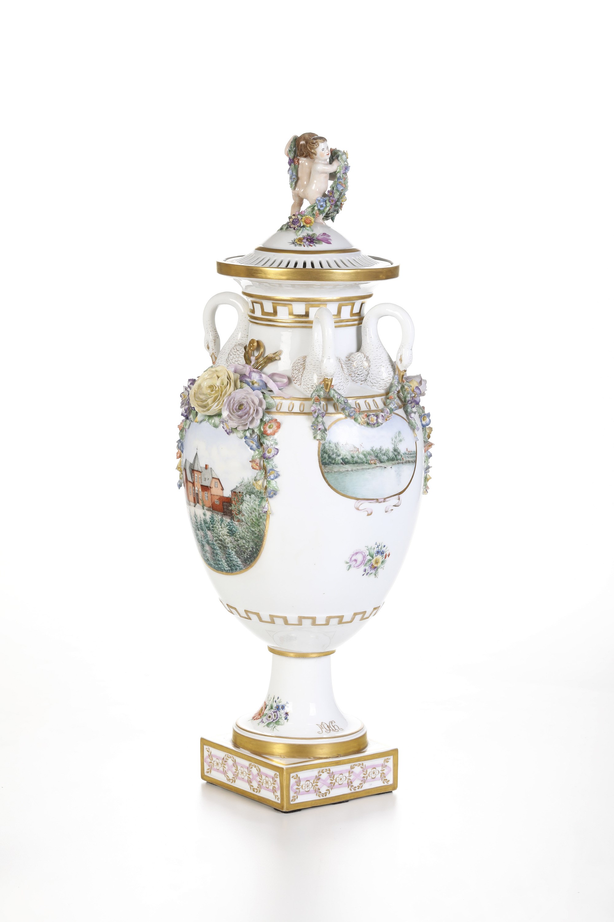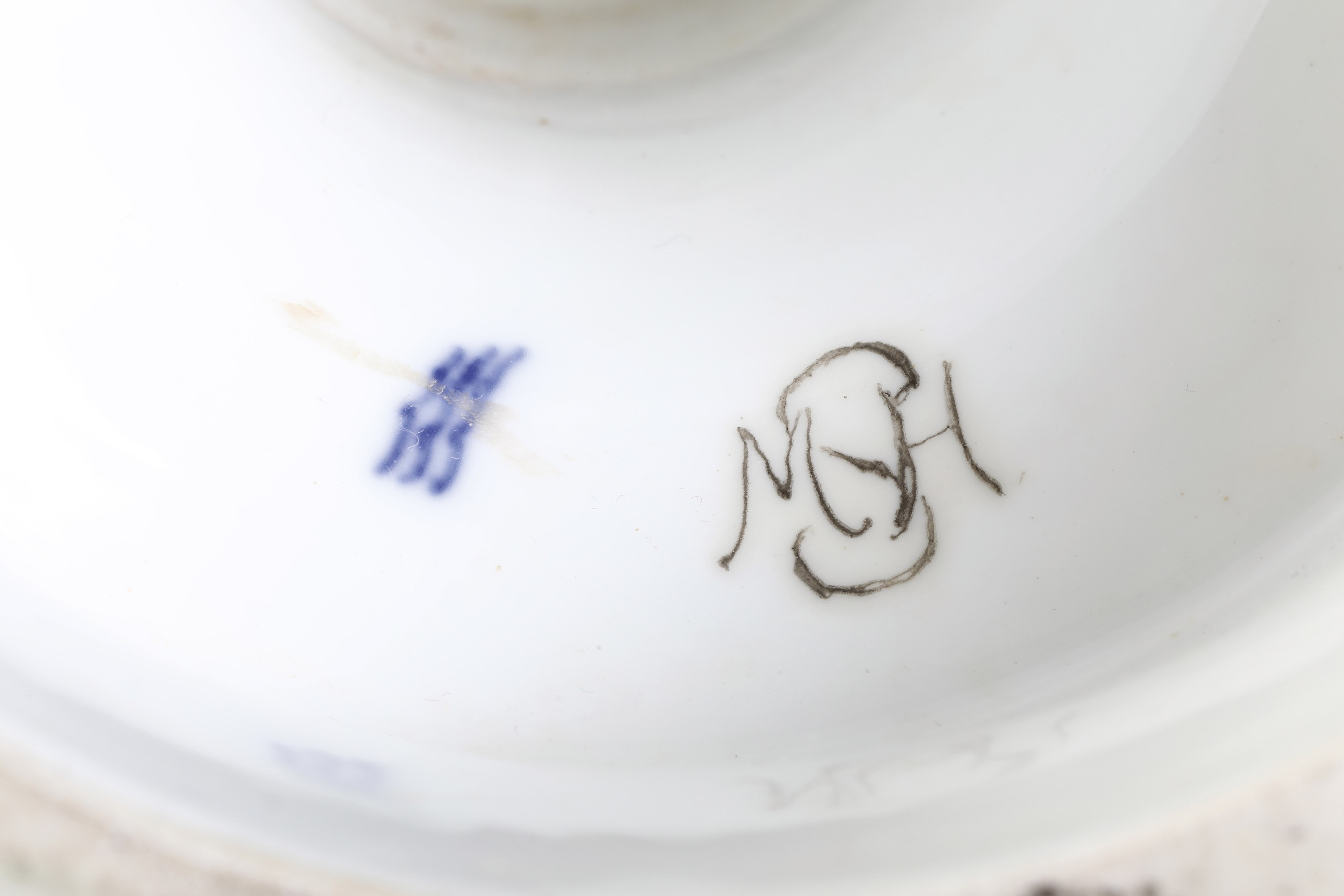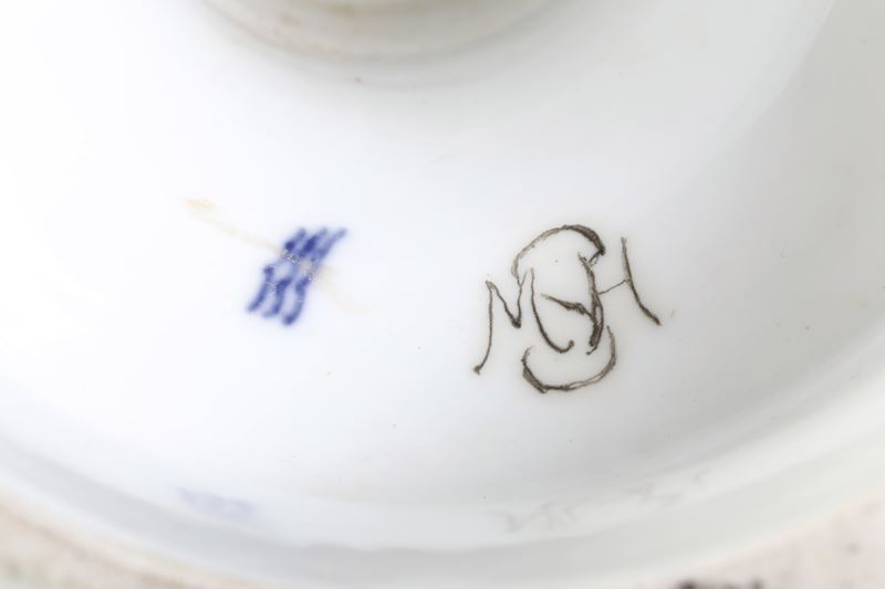 Porcellana. Marca: onde in blu e firma hausmaler. Altezza cm 59. Conservazione: ottima; insignificanti mancanze alla vegetazione; la decorazione è stata eseguita da hausmaler