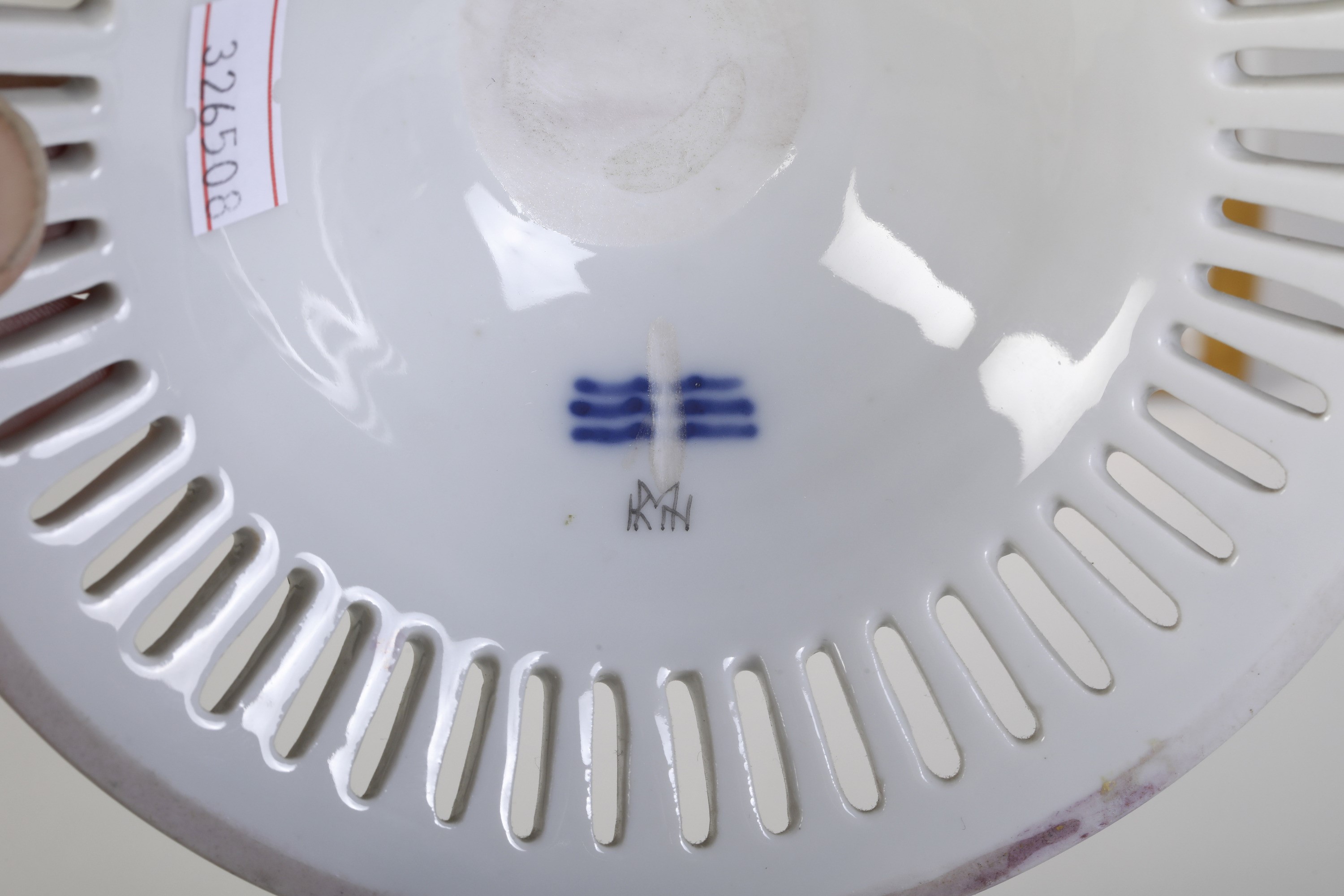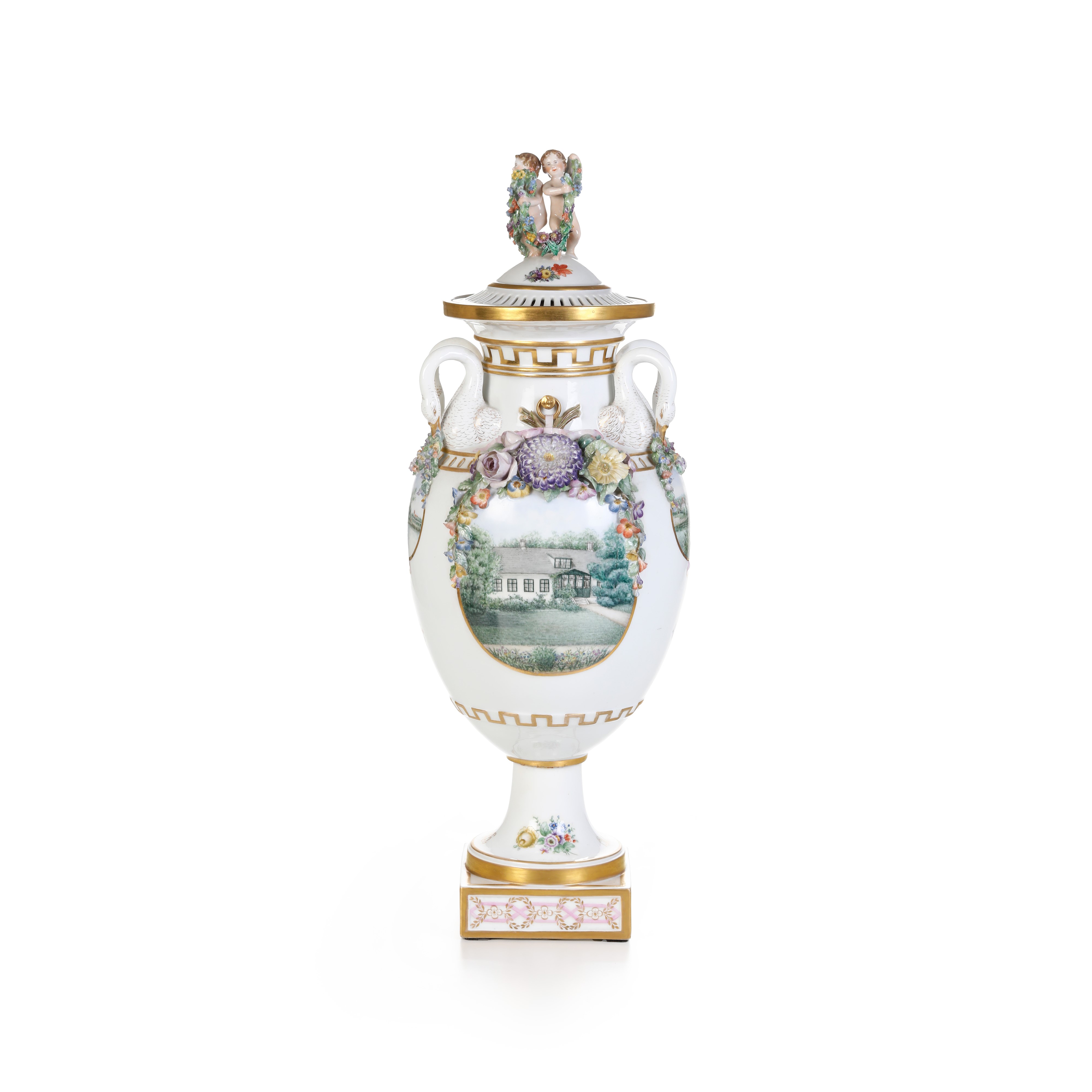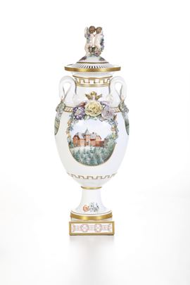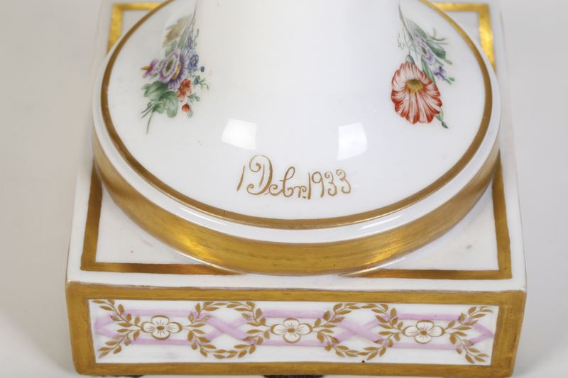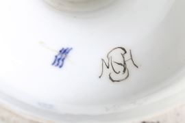 Porcellana. Marca: onde in blu e firma hausmaler. Altezza cm 59. Conservazione: ottima; insignificanti mancanze alla vegetazione; la decorazione è stata eseguita da hausmaler