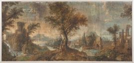 Scuola del XVIII-XIX secolo Paesaggio fluviale con imbarcazioni e pescatori